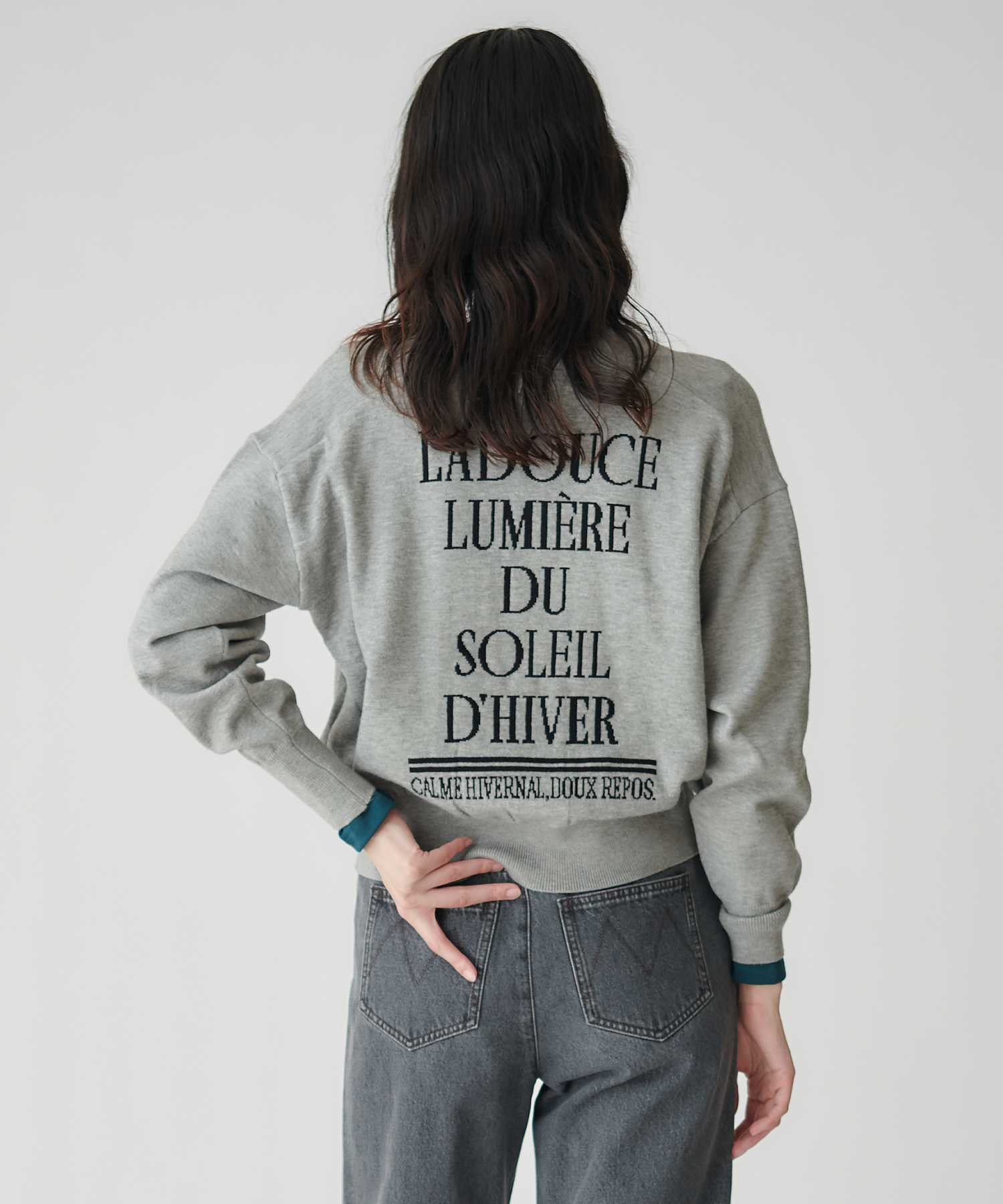 後ろ身頃の袋ジャガード部分は程よい厚みで立体感を出しつつ、軽やかさもキープ。