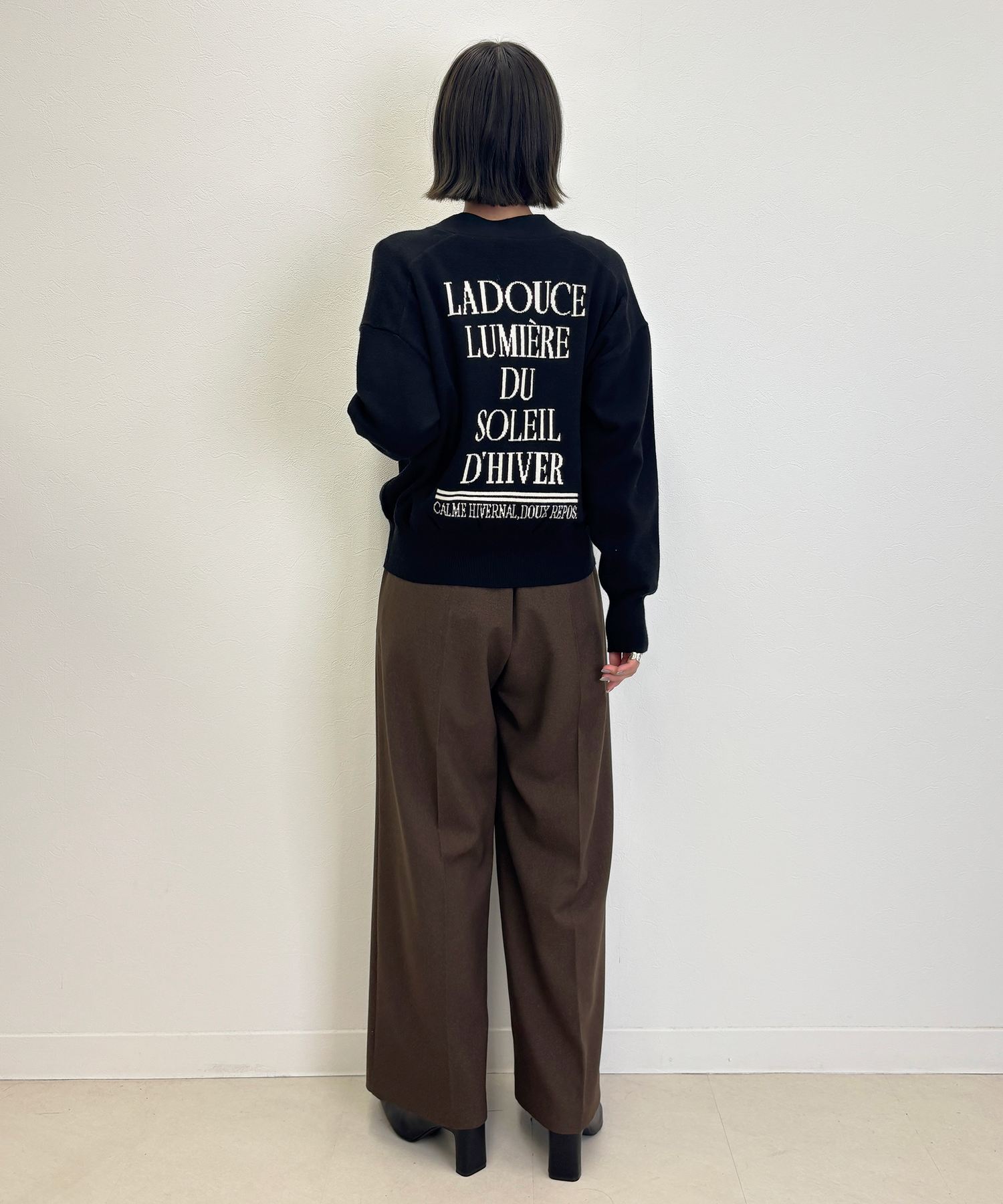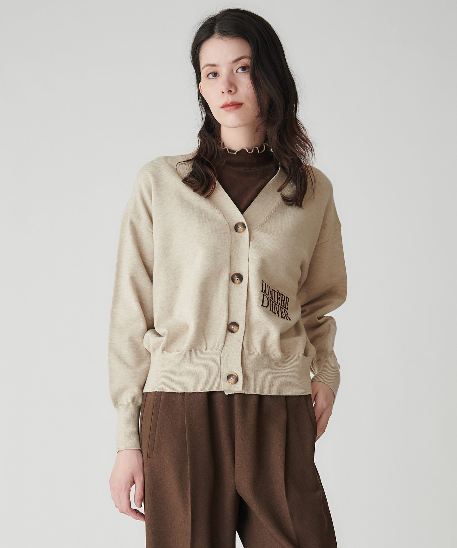 Mylanka定番のロゴジャガードカーディガン。