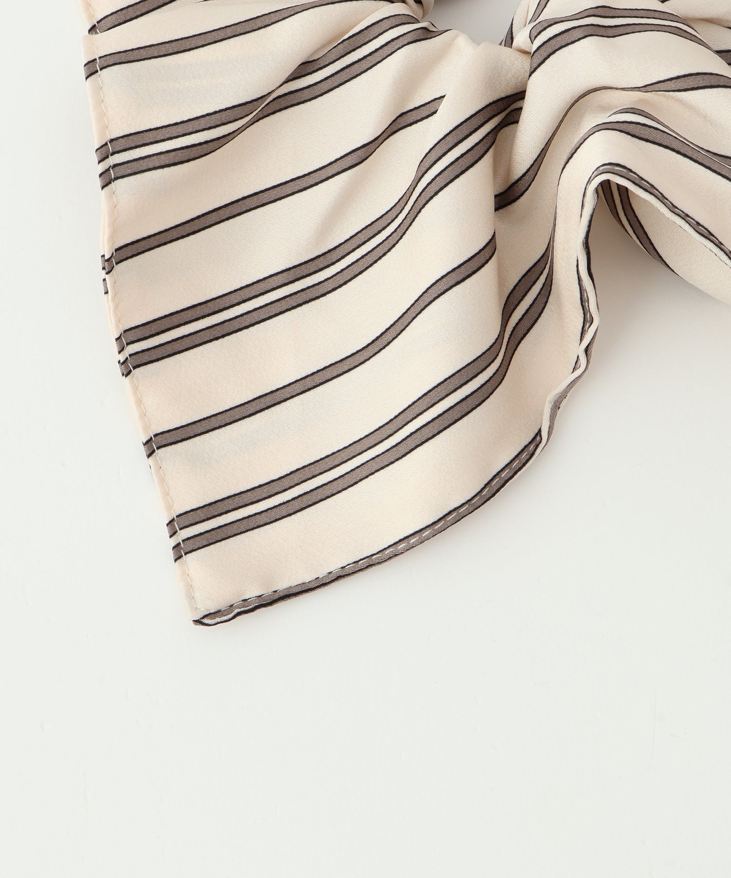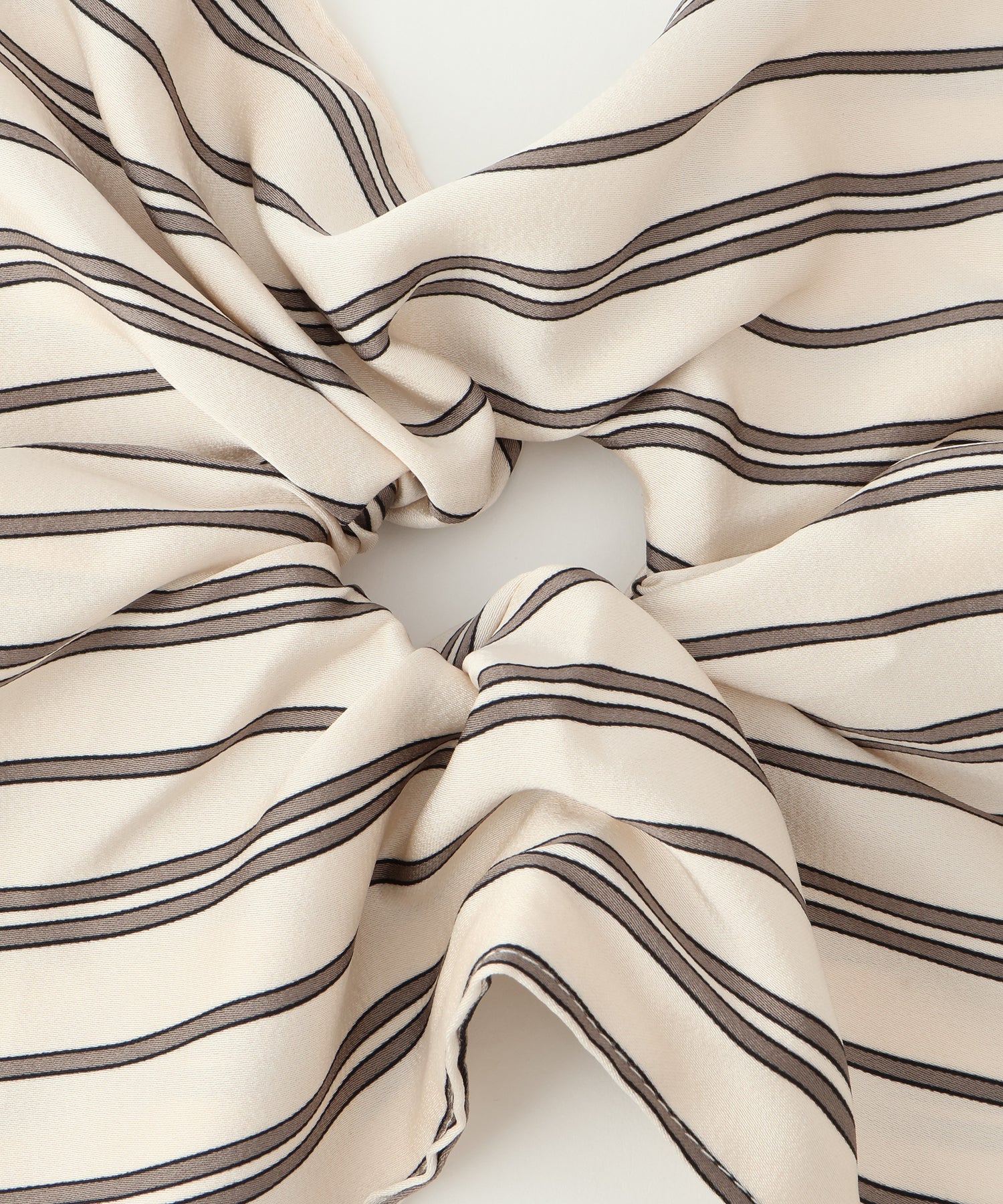 ストライプ柄が目を惹く、存在感のあるシュシュ。程よいボリューム感で、コーディネートのアクセントに。
