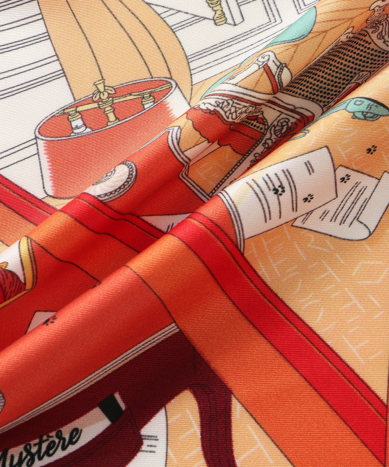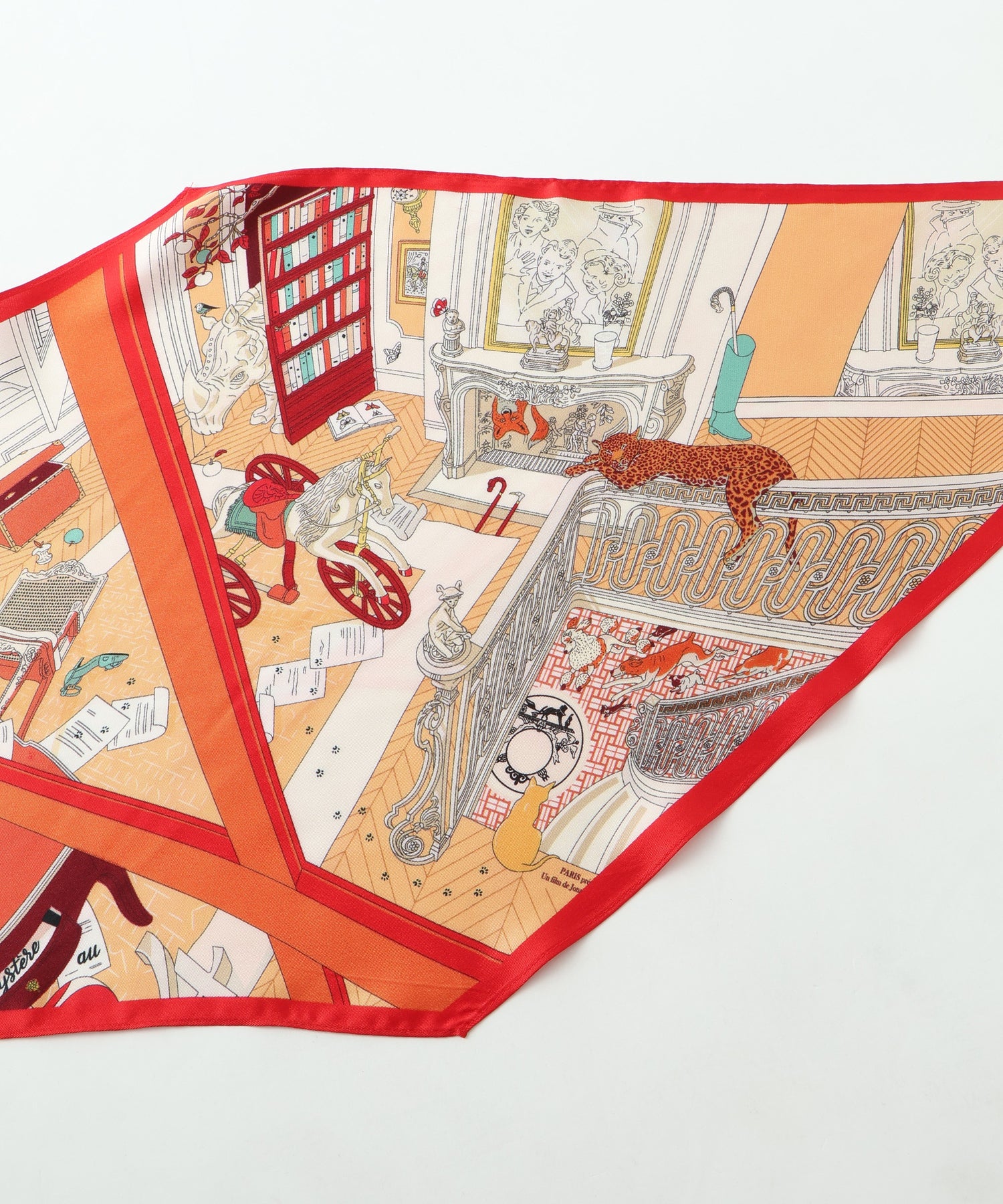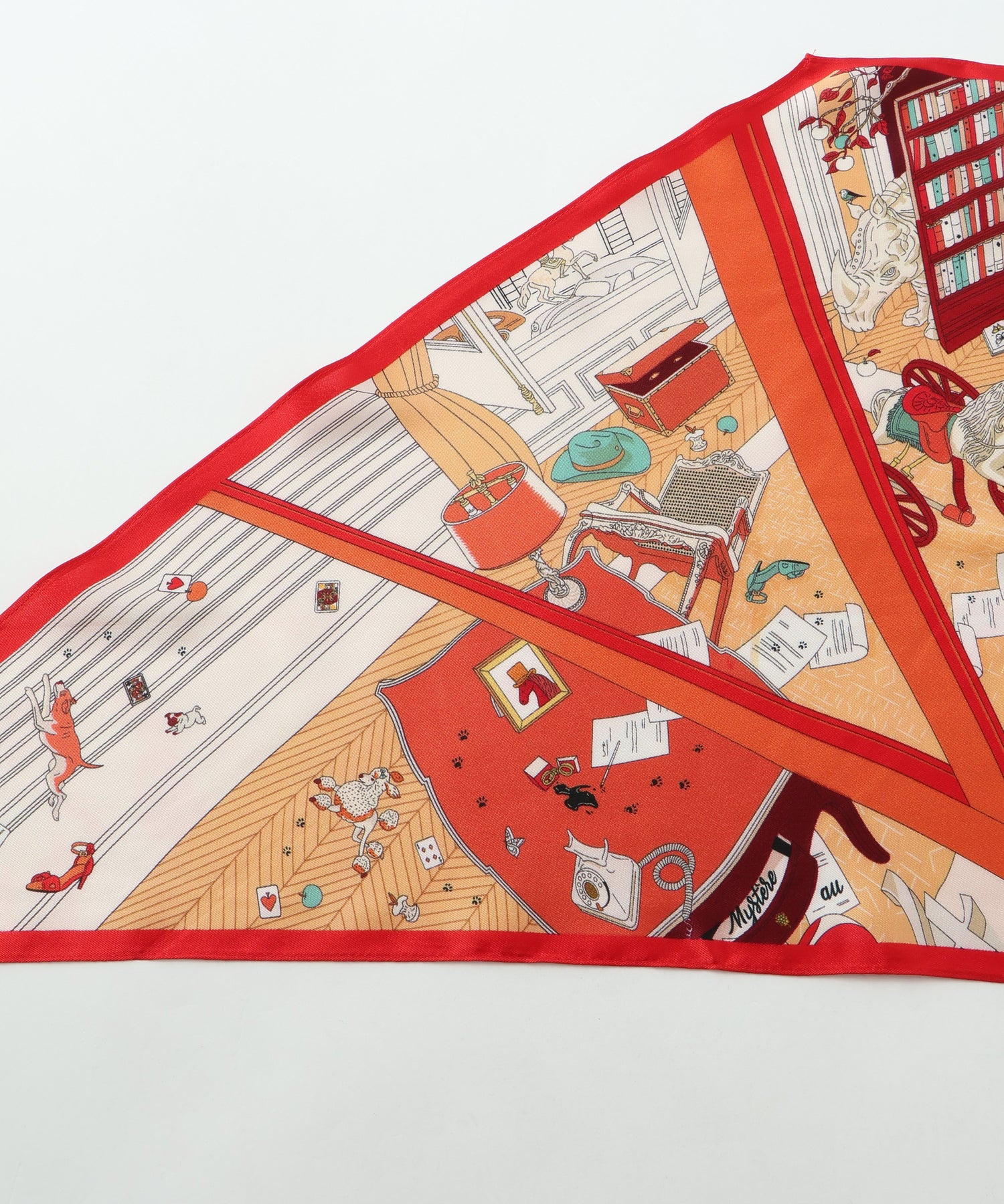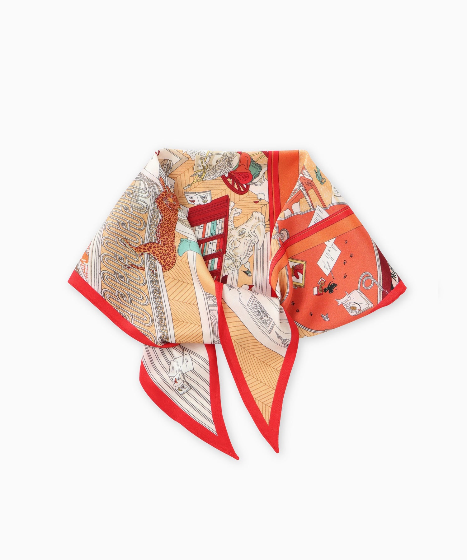 クラシカルなプリントが目を惹くダイヤ型スカーフ。