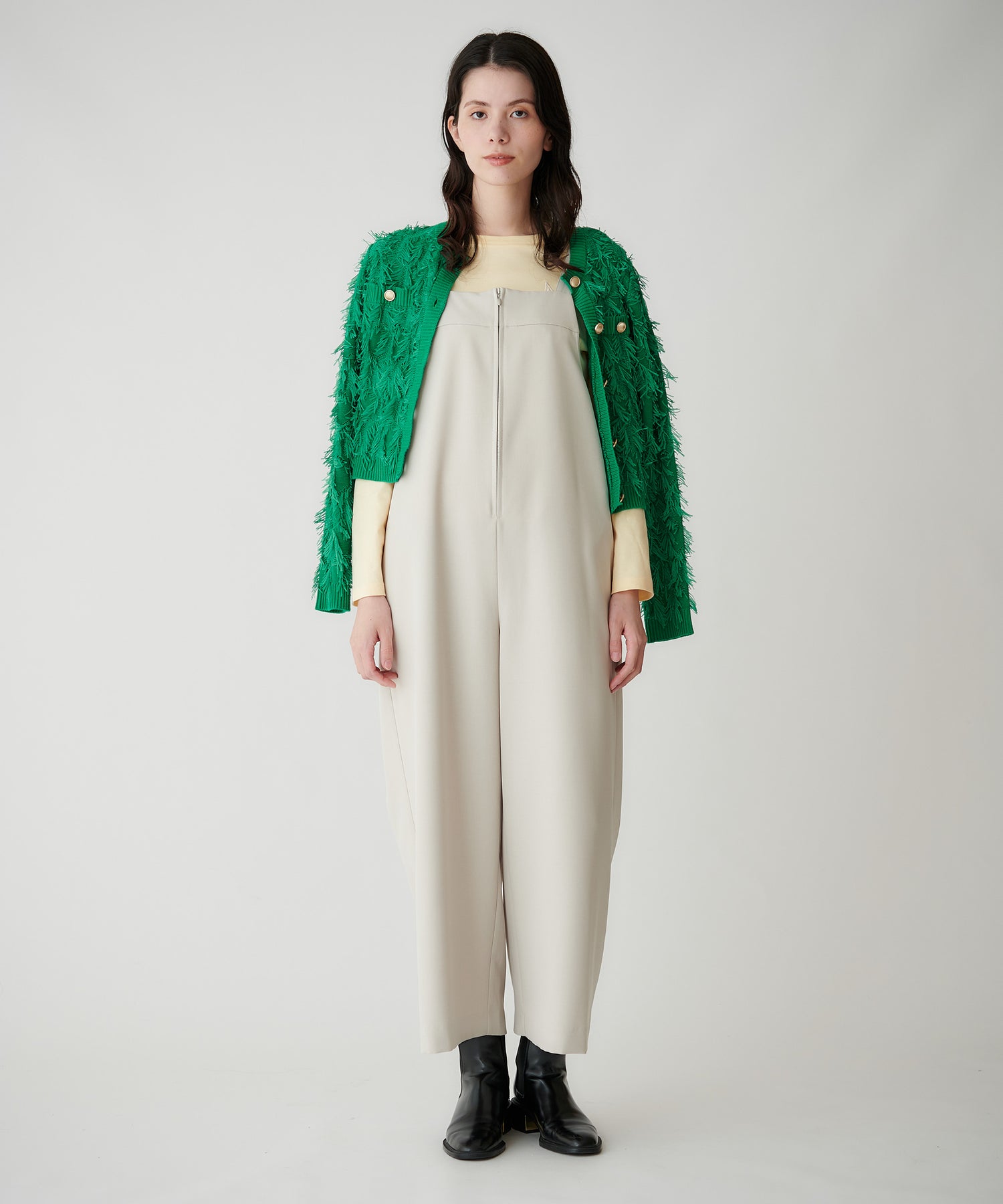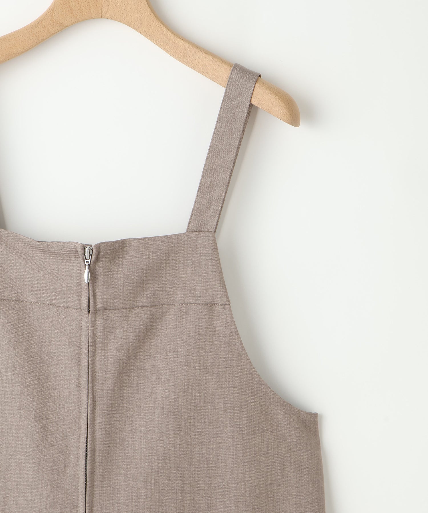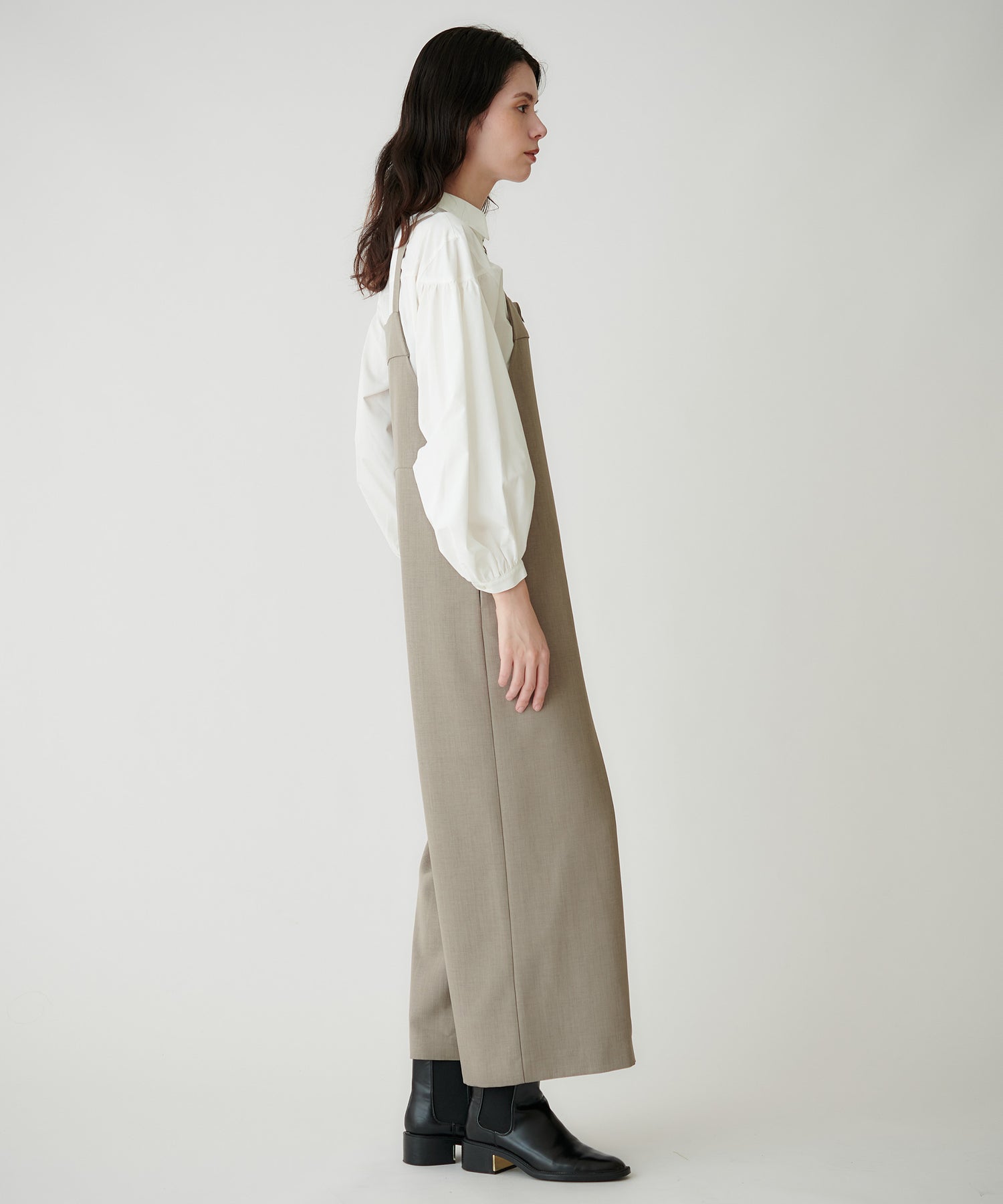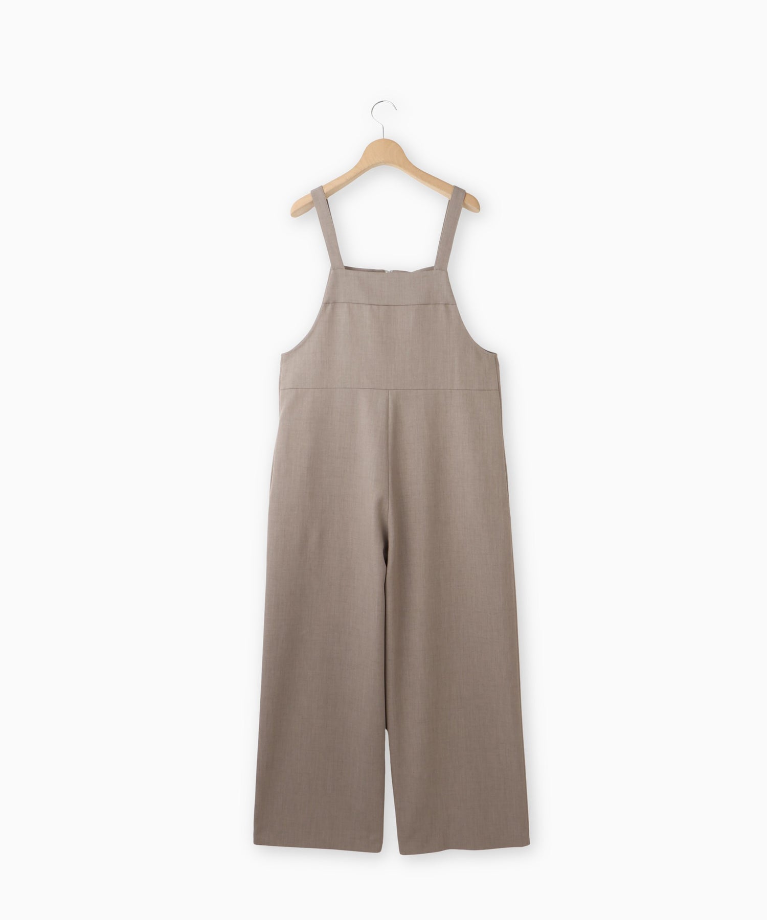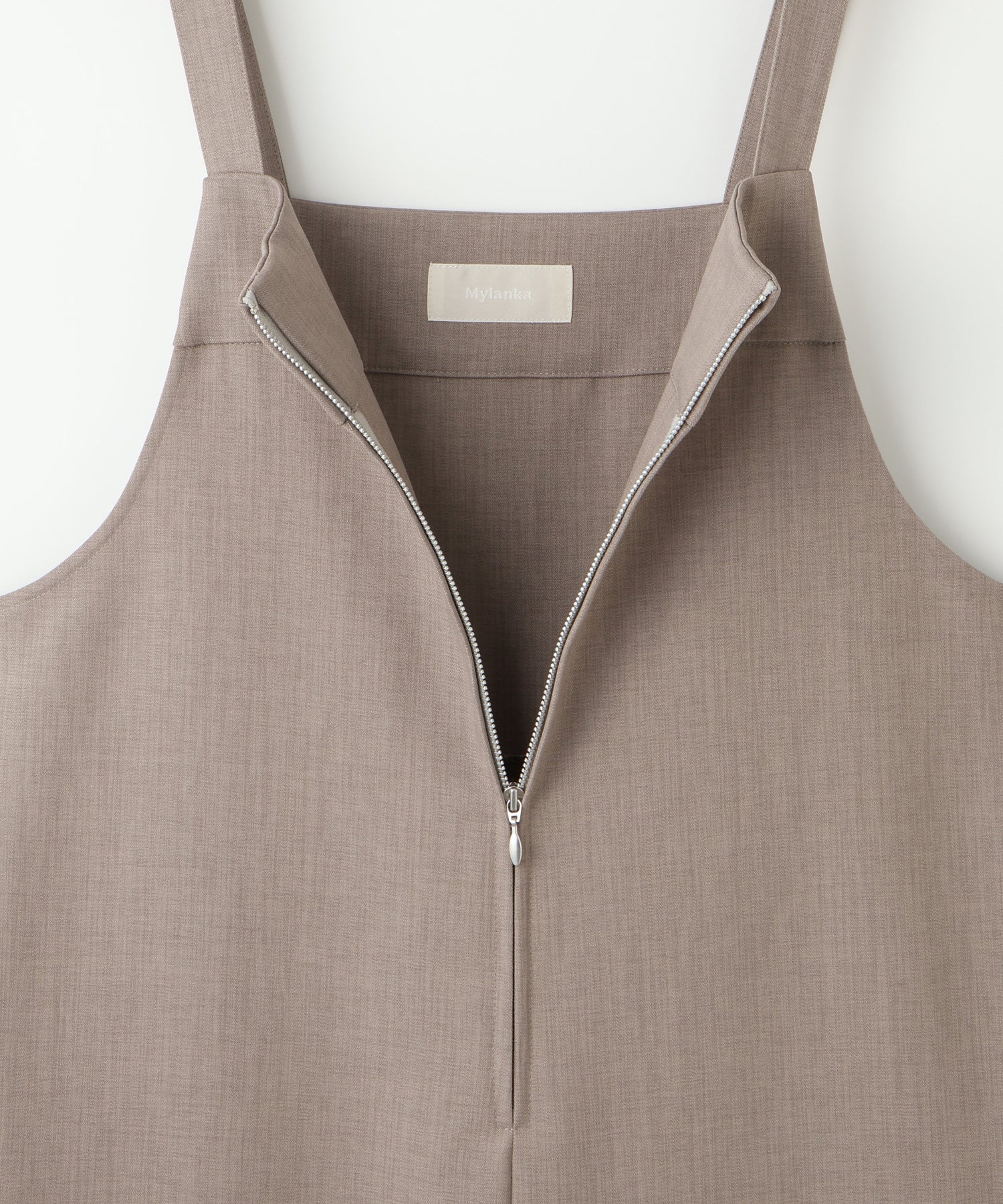 フロントジップ仕様で着脱しやすく、すっきりとした印象に仕上げたサロペット。
