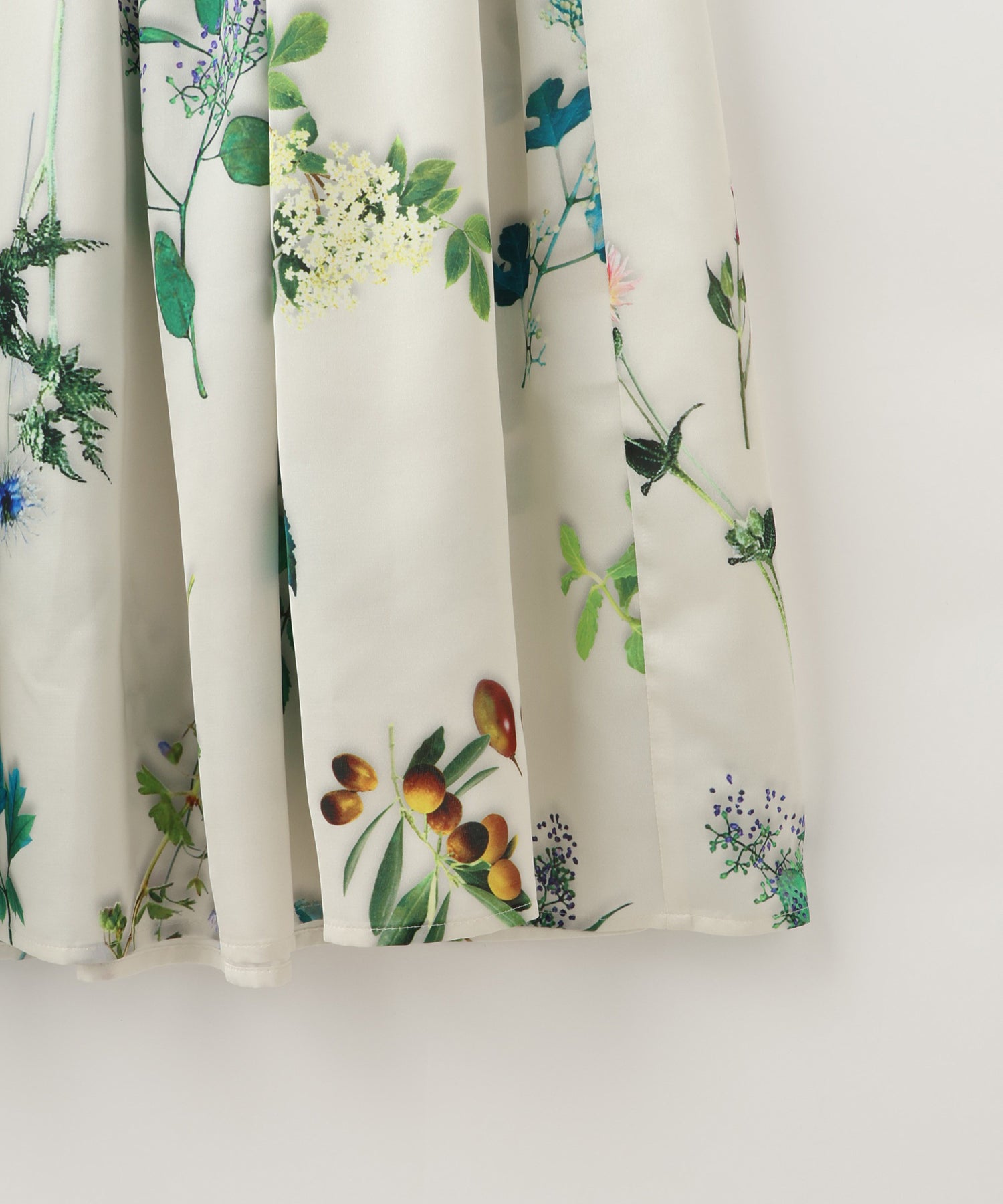 裾がディアードデザインのボタニカル柄ワンピース。