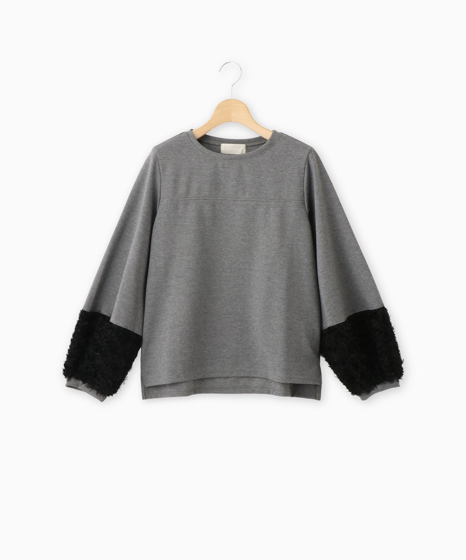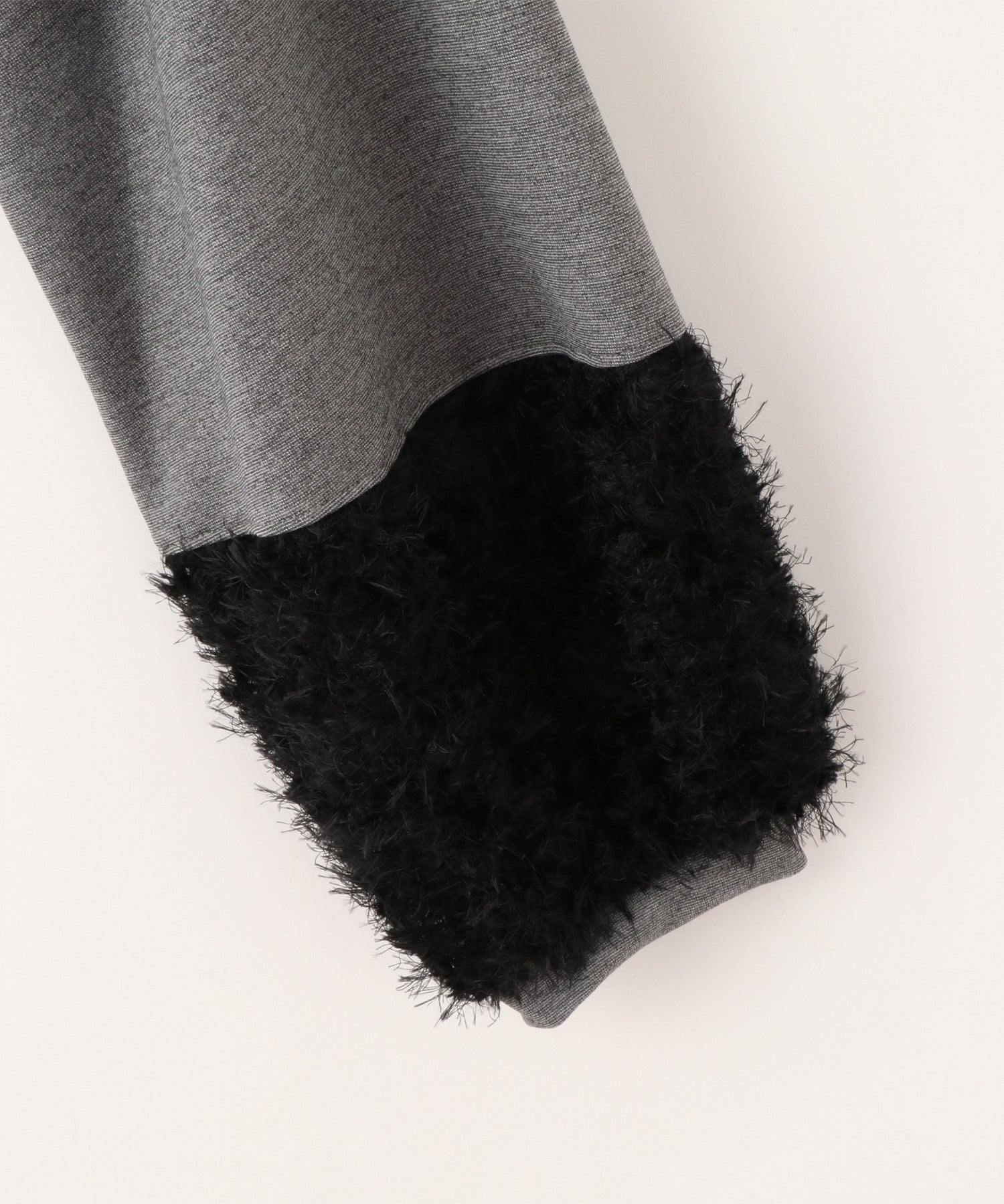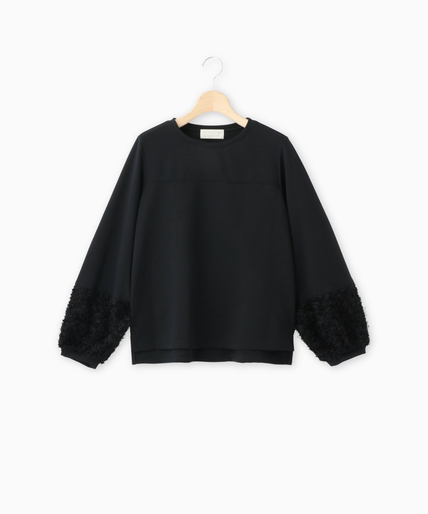 軽くしっとりとしたポンチ素材に、ラグジュアリー感漂うフェザー生地をドッキングしたトップス。袖口のフェザー切り替えが動くたびにふんわりと揺れ、上品で女性らしい印象を与えます。