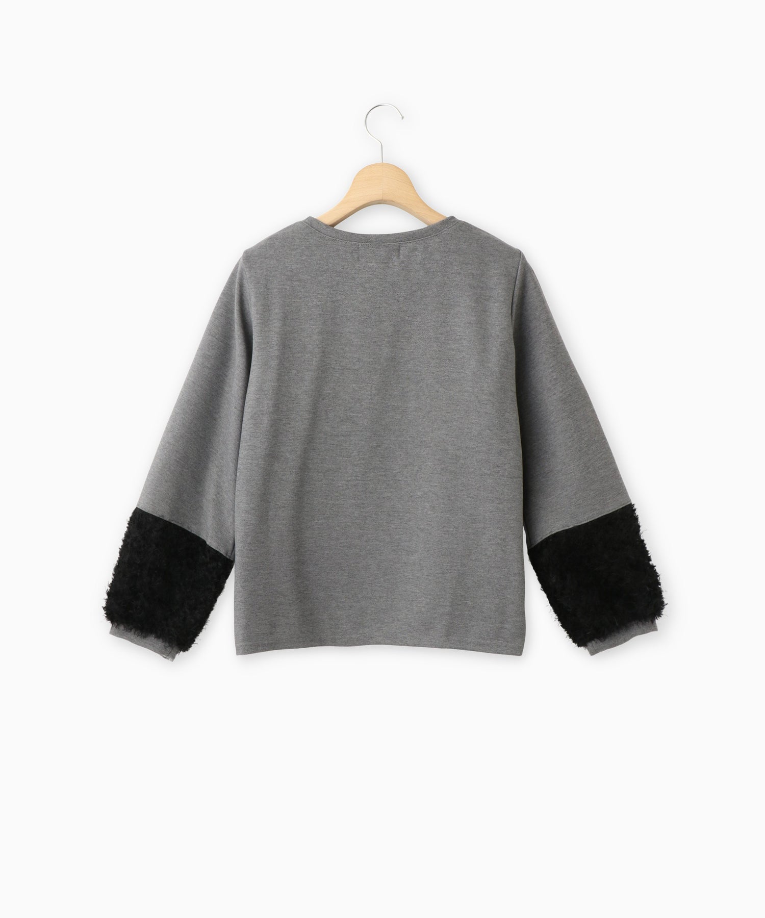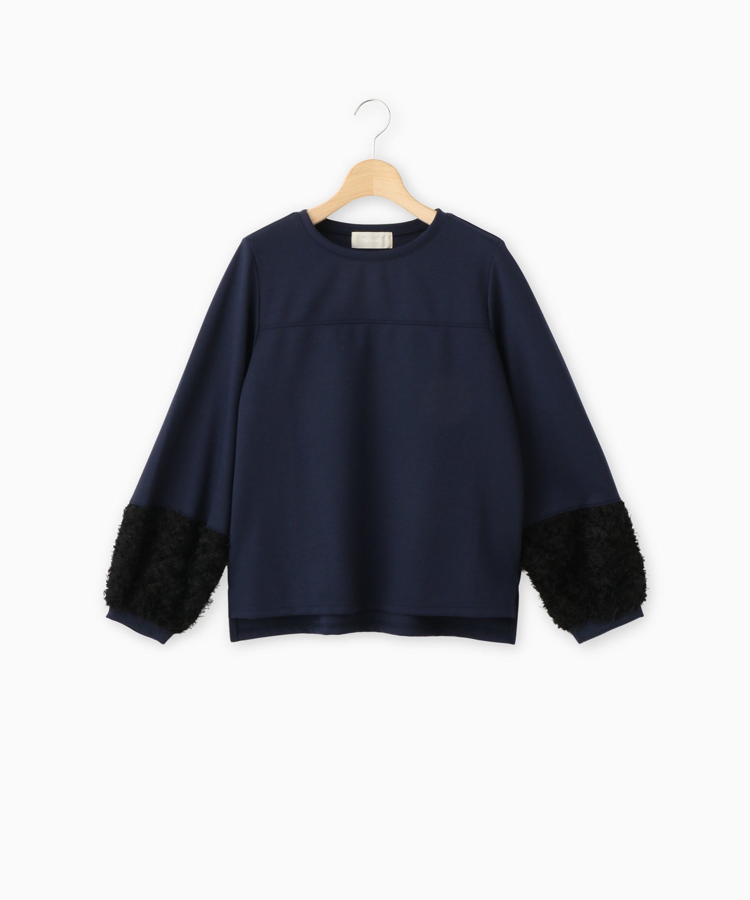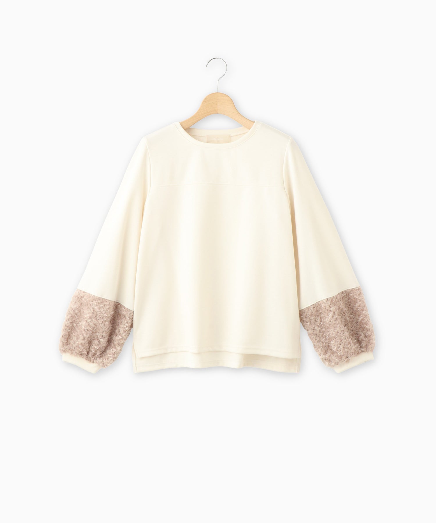 軽くしっとりとしたポンチ素材に、ラグジュアリー感漂うフェザー生地をドッキングしたトップス。袖口のフェザー切り替えが動くたびにふんわりと揺れ、上品で女性らしい印象を与えます。