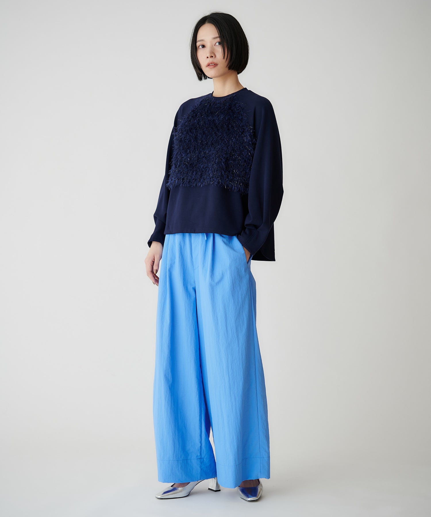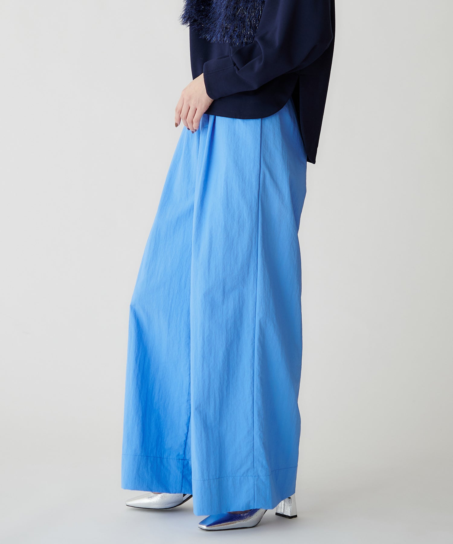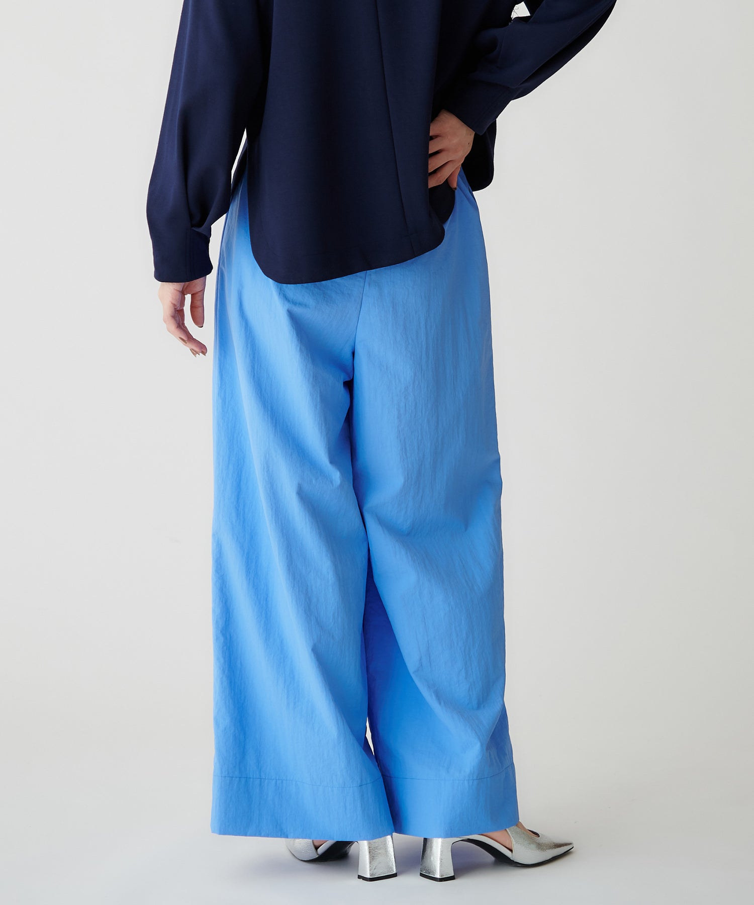 コンパクトなニットやブラウスを合わせて、パンツの軽やかな素材感を引き立てたスタイルがおすすめ。