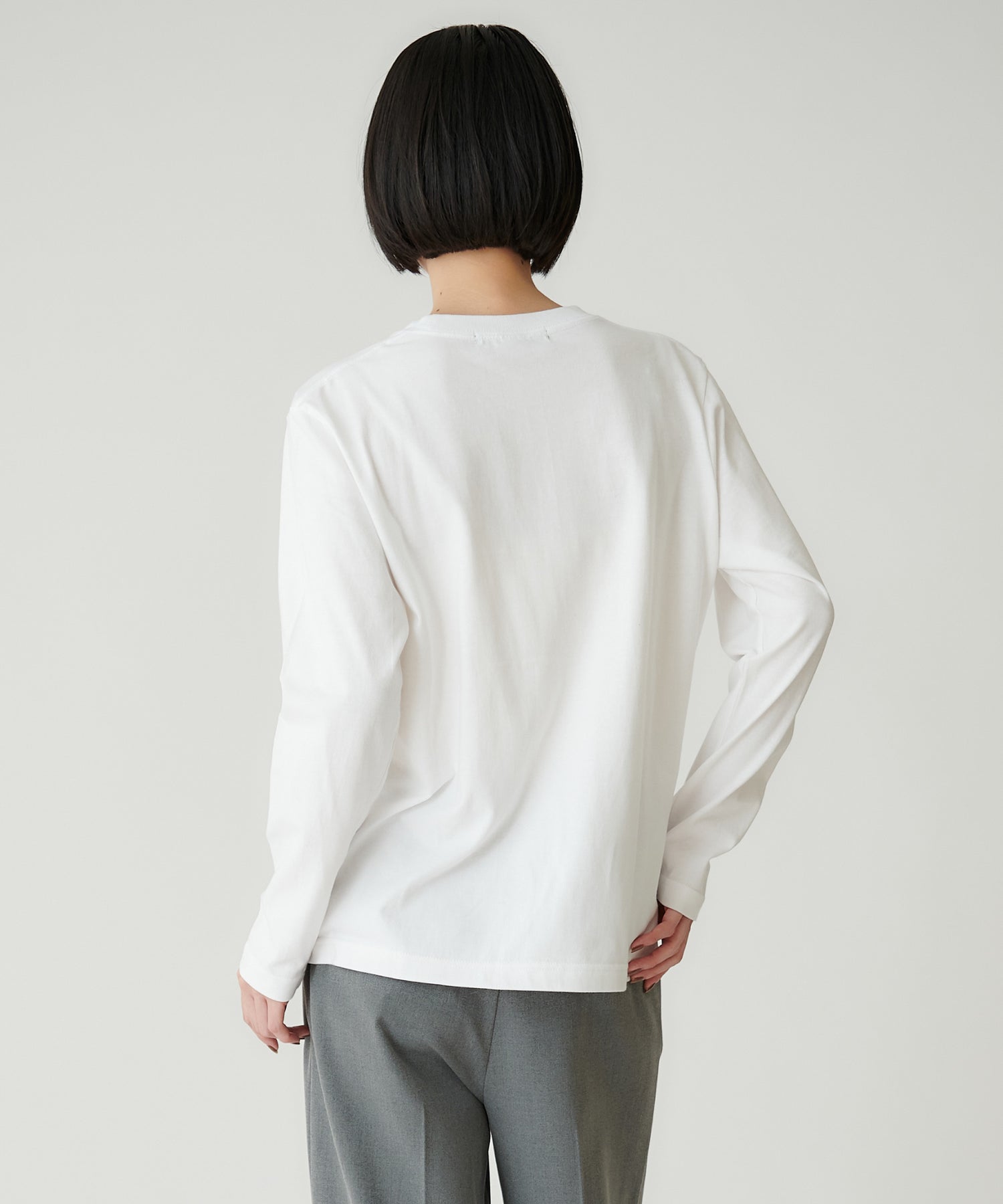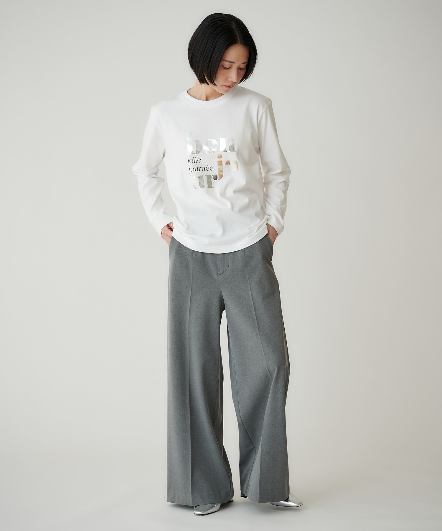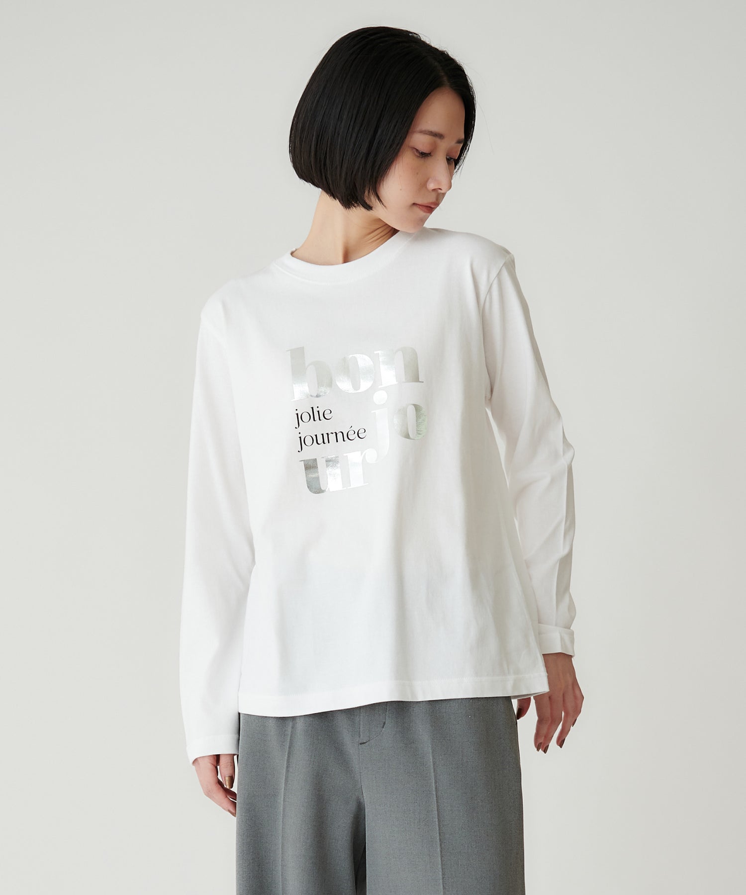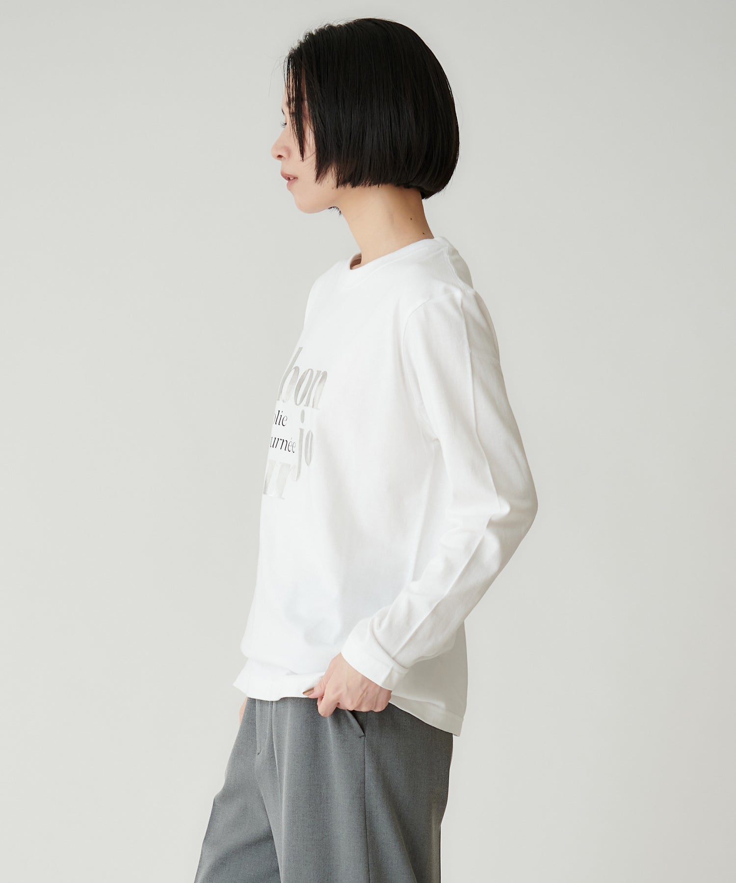 前身頃に大胆にプリントされたロゴは、フランス語で「こんにちは」と素敵な一日というメッセージを込めた一枚。シンプルながら印象的な箔プリントが目を惹きます。