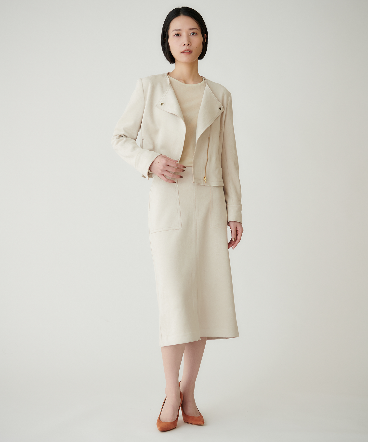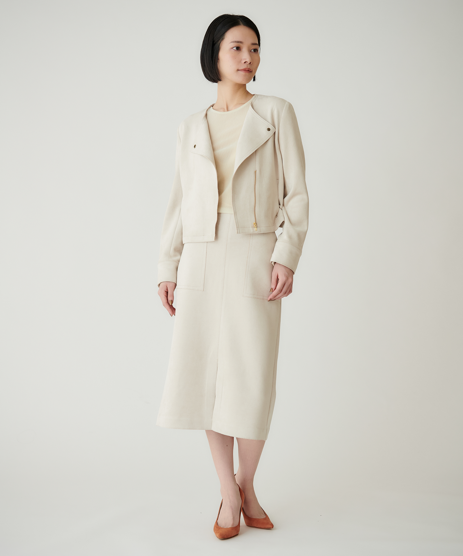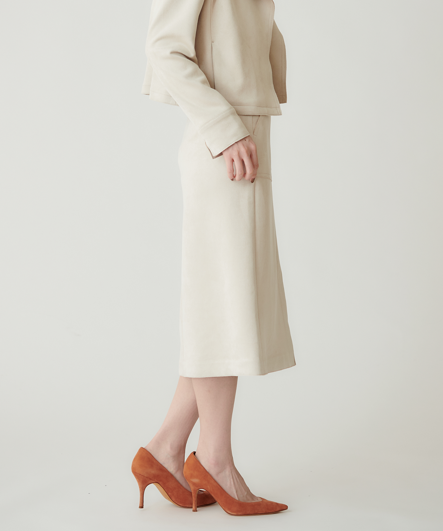 台形型でフロントスリットが女性らしさを演出するミディアム丈のスカート。