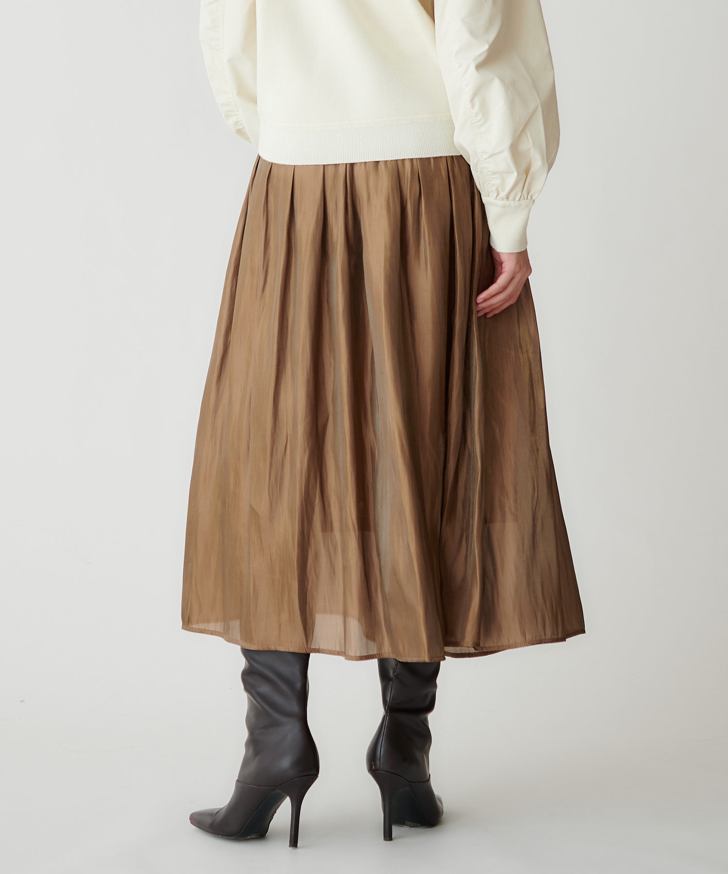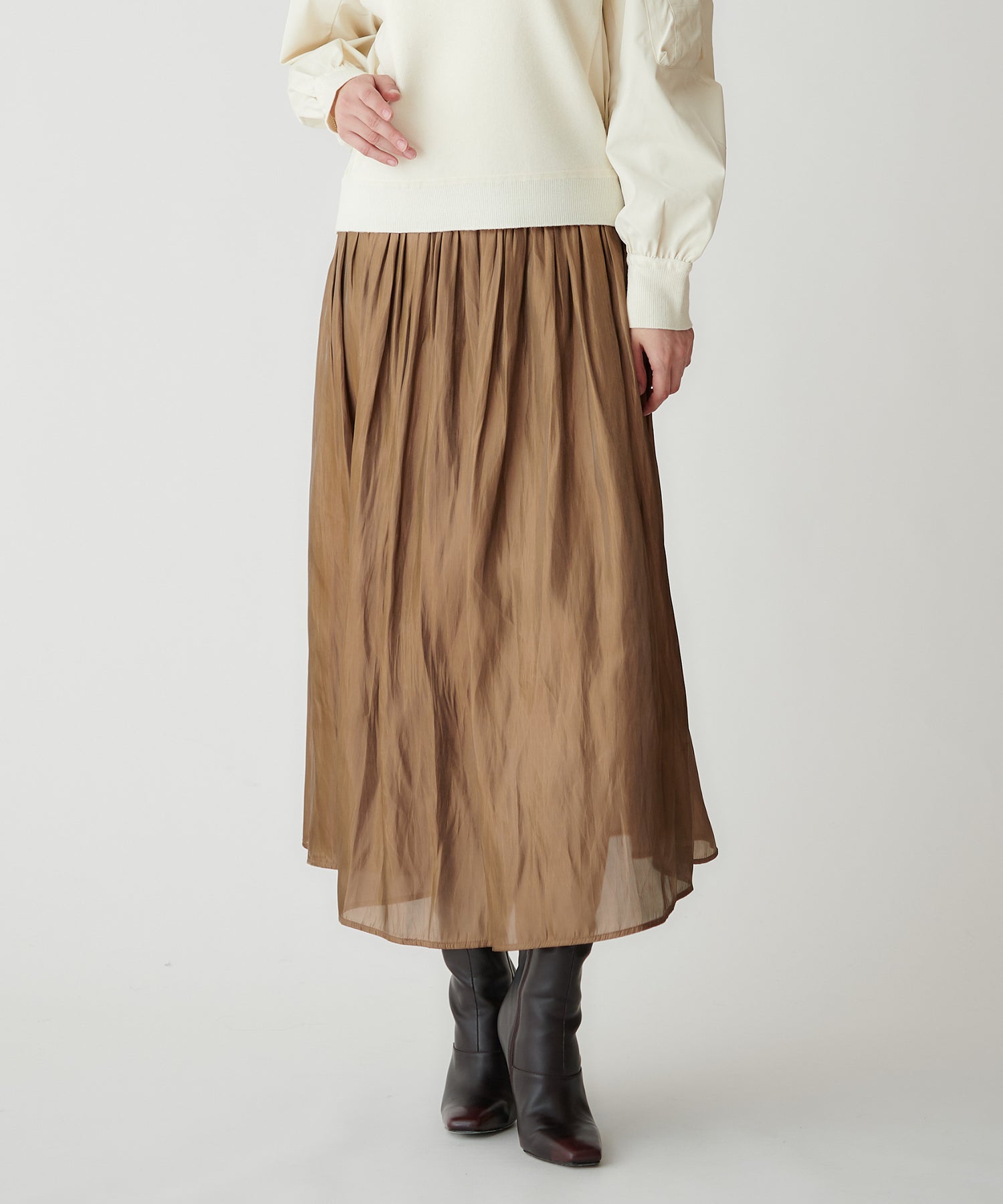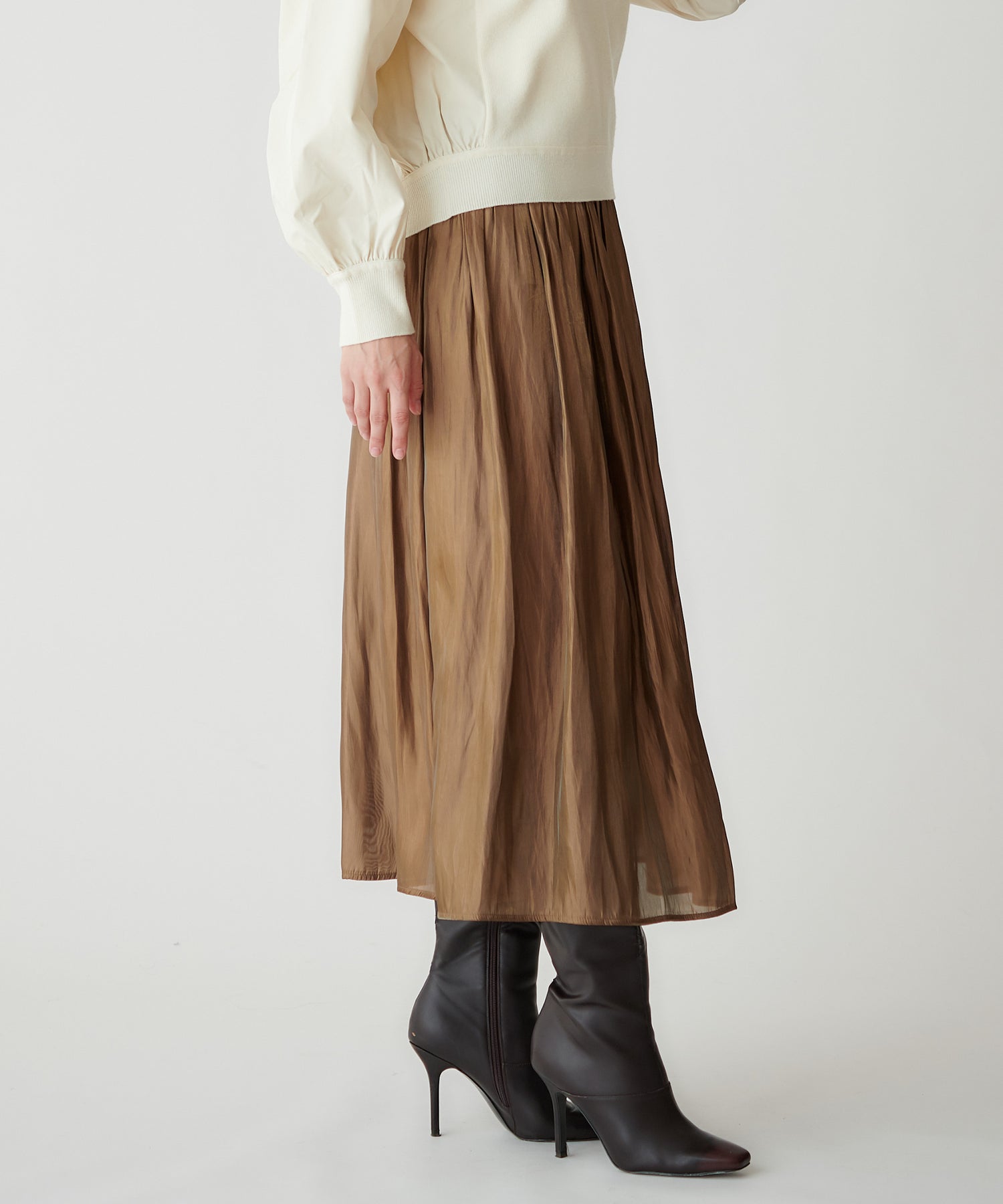 歩くたびに光がにじむように表情を変える、ニュアンスのある艶が魅力です。ギャザーをたっぷり入れたフレアシルエットが、女性らしい柔らかさを演出します。