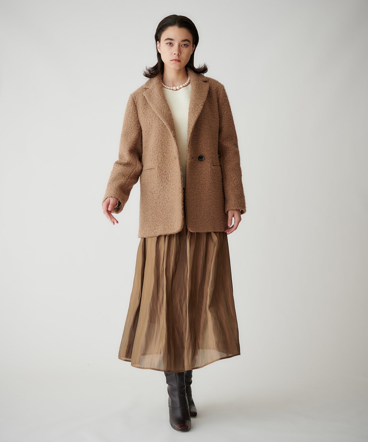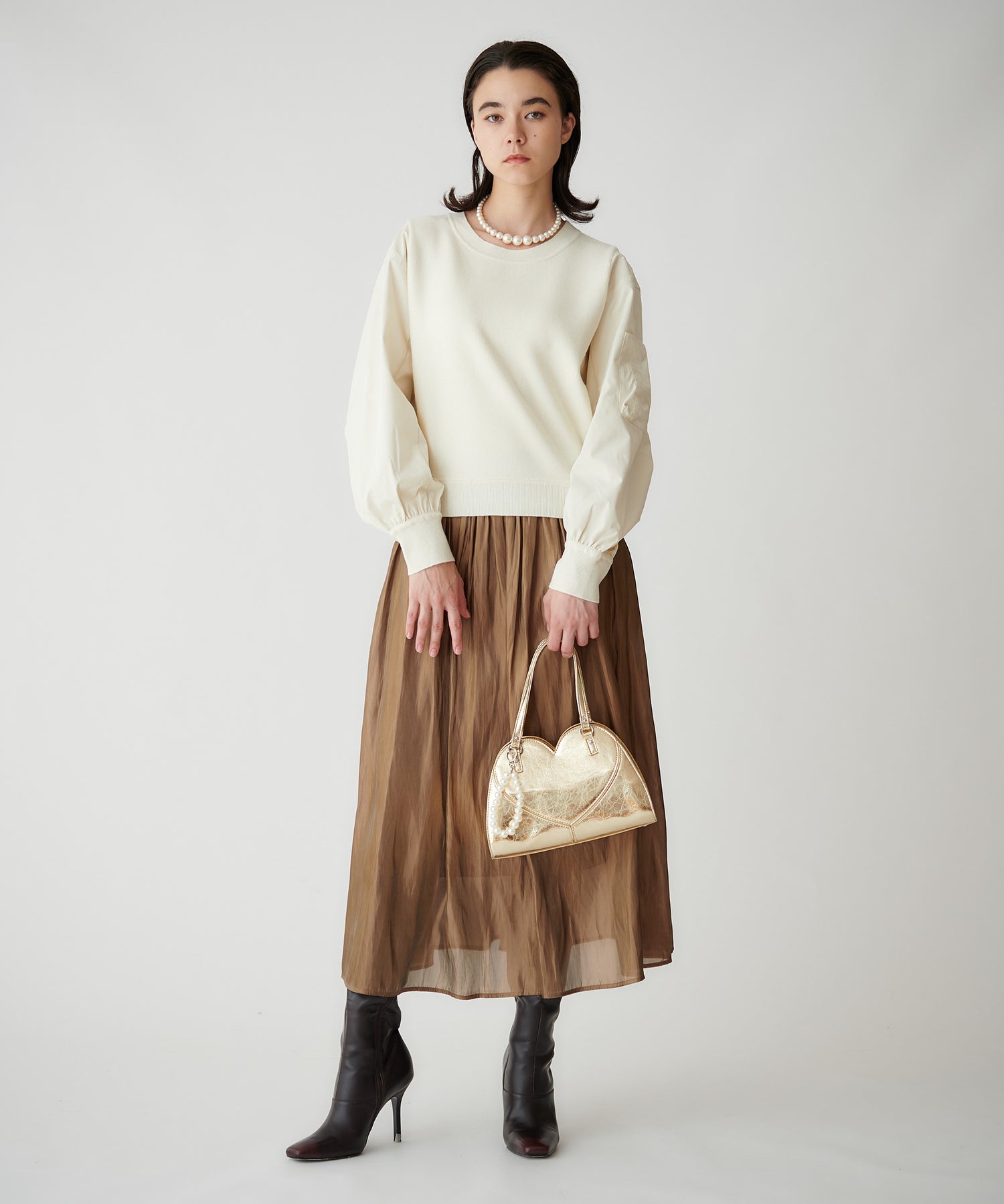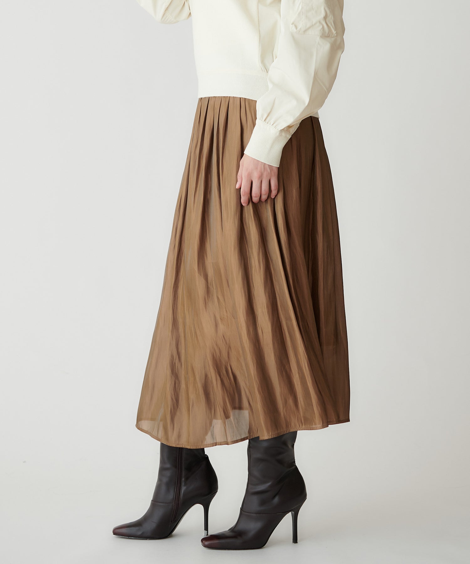 歩くたびに光がにじむように表情を変える、ニュアンスのある艶が魅力です。ギャザーをたっぷり入れたフレアシルエットが、女性らしい柔らかさを演出します。