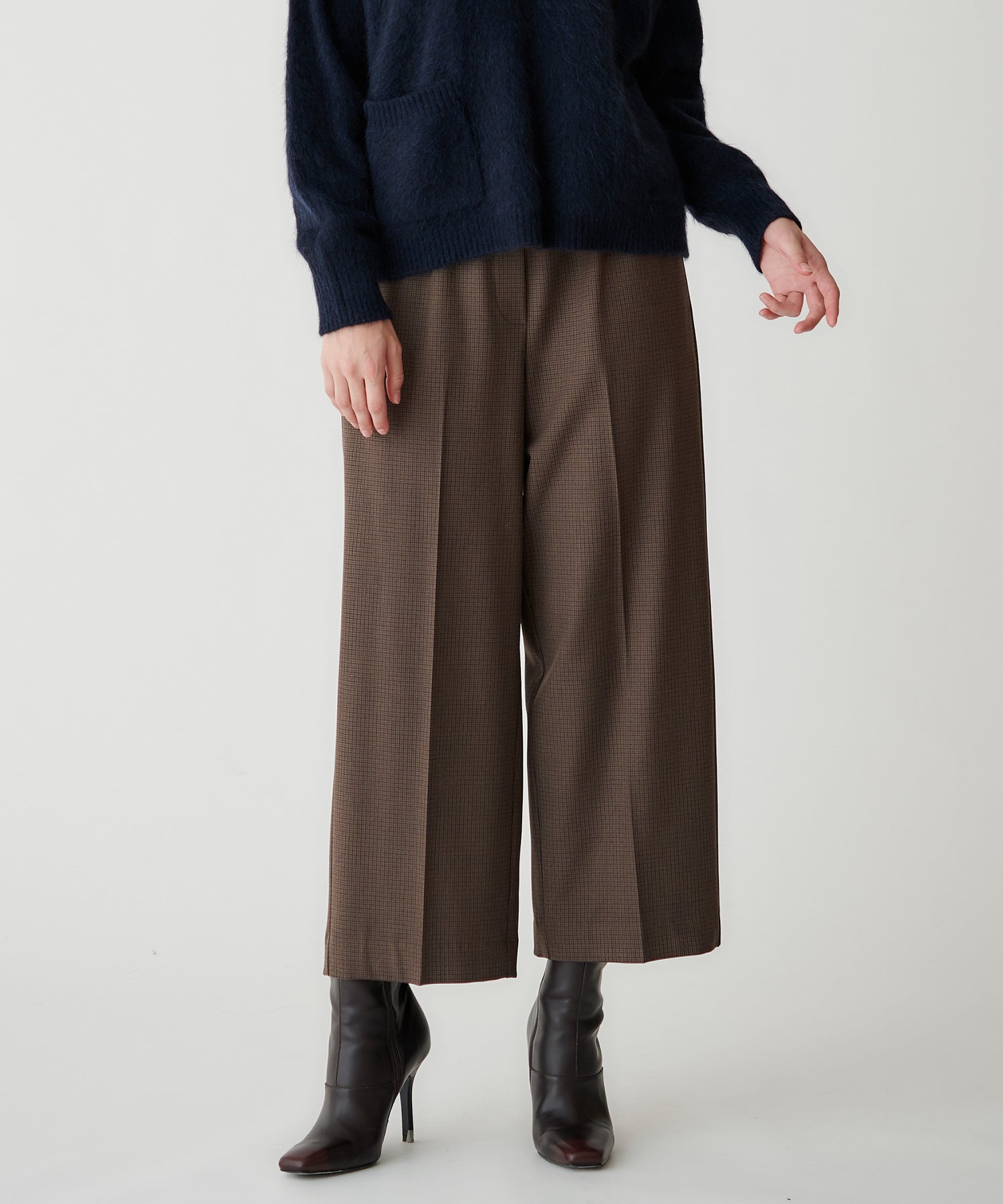 程よいボリュームとストンと落ちるシルエットが脚のラインを拾わず、すっきりとした印象に仕上げます。ウエストは総ゴム仕様で、快適な穿き心地と上品な見た目を両立。ブーツ合わせもしやすいクロップド丈です。