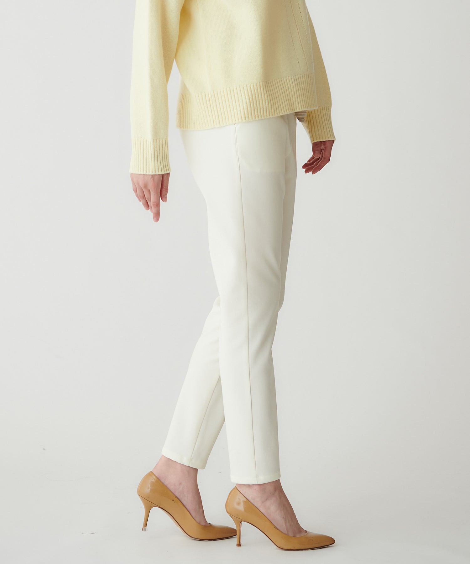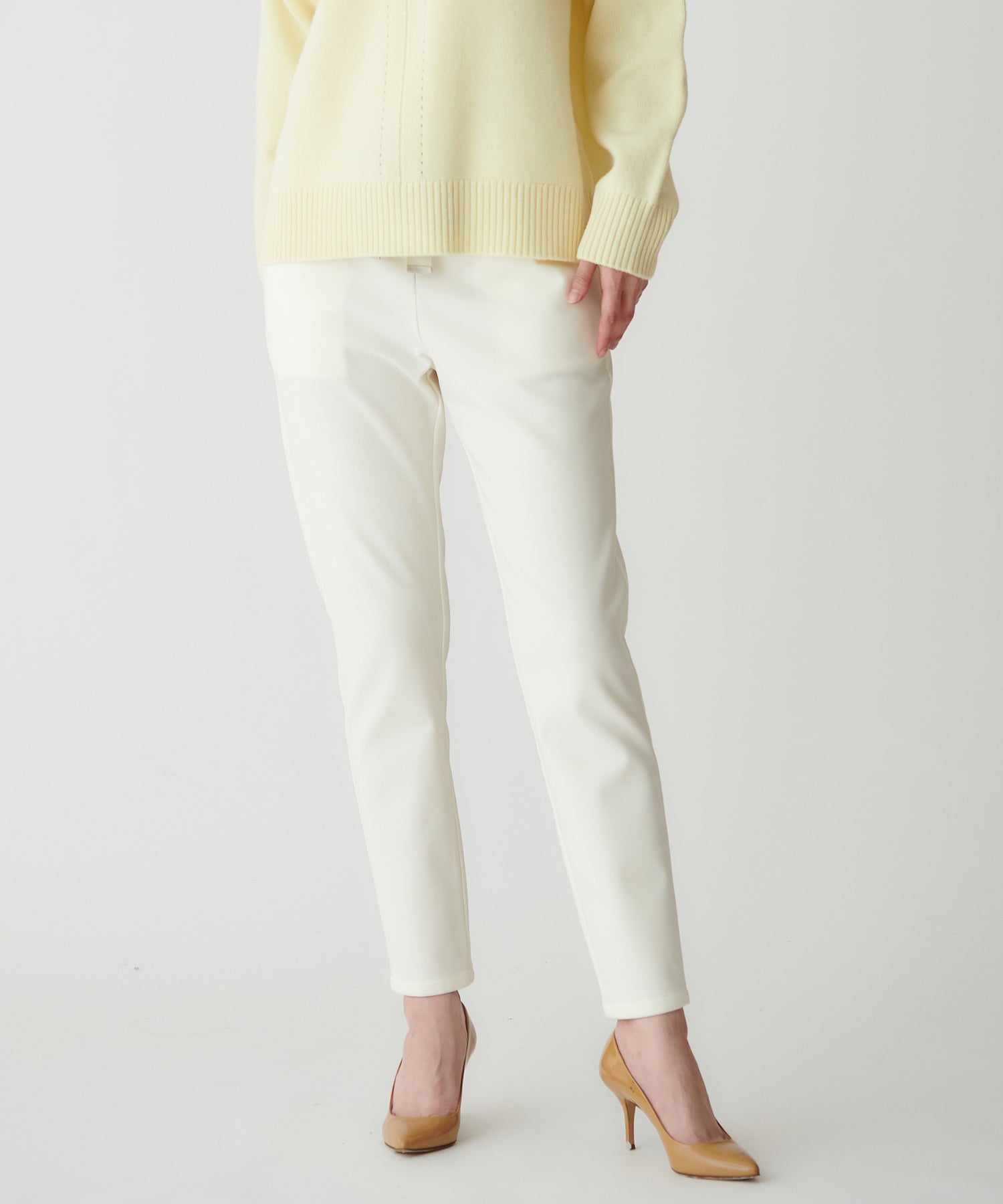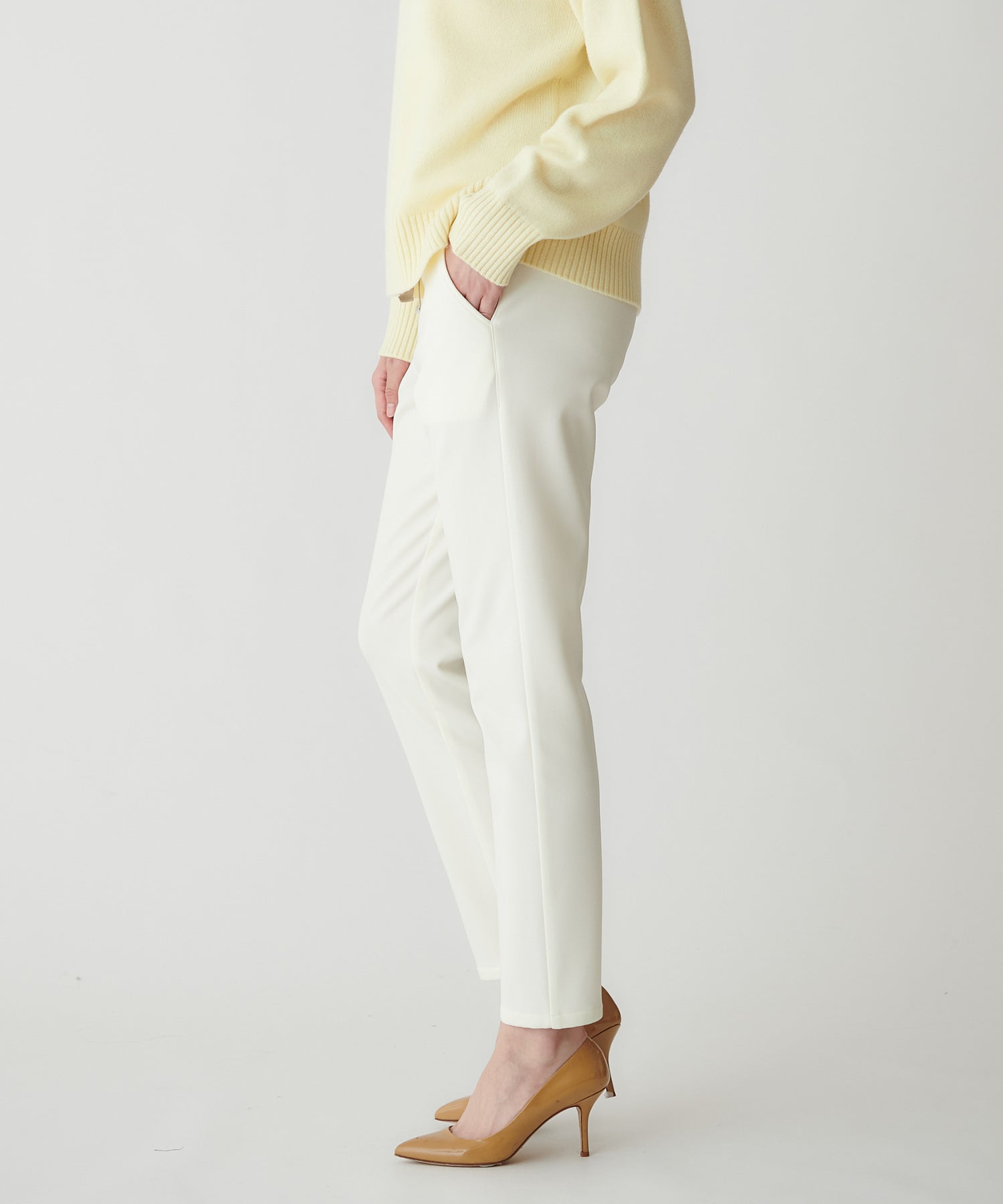 脚のラインをきれいに整えるテーパードシルエットで、スタイルアップ効果も。