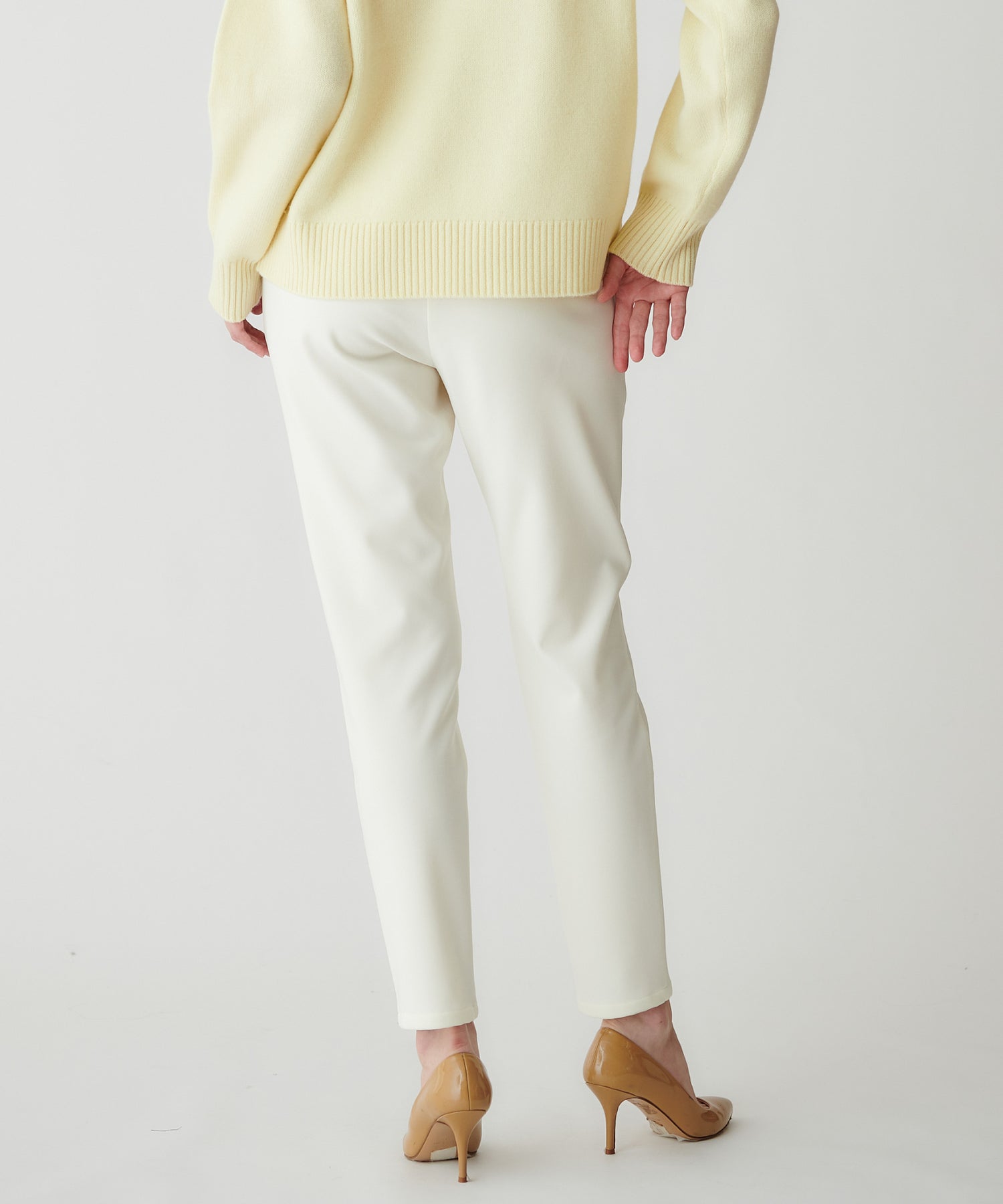 淡色トップスやキャメル系シューズと合わせると、柔らかいワントーンスタイルが完成します。