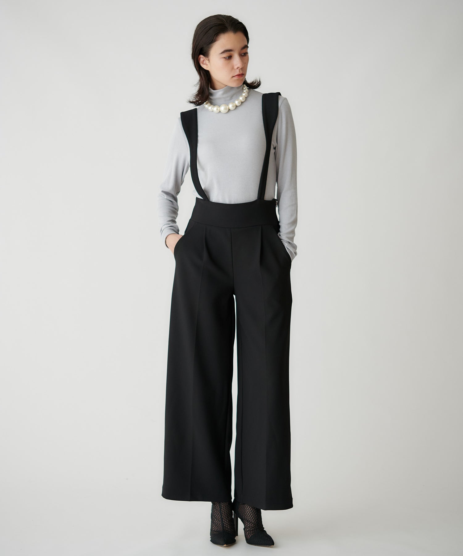 太めストラップとハイウエストの切り替えが、上半身をすっきりと見せるサロペット。