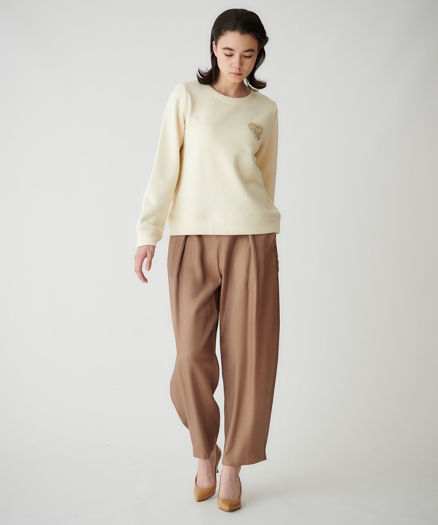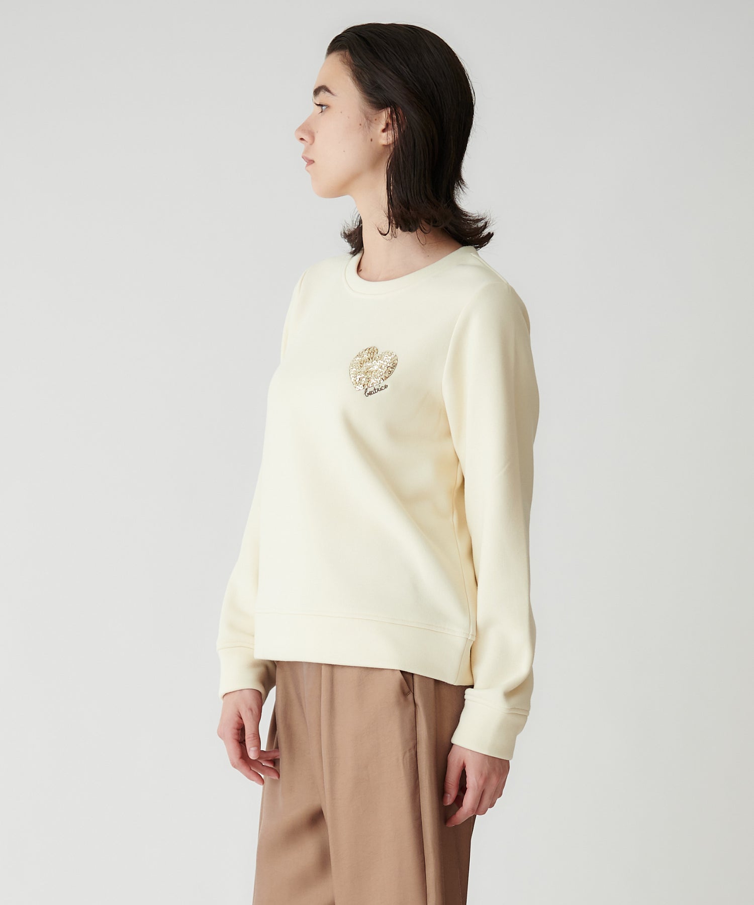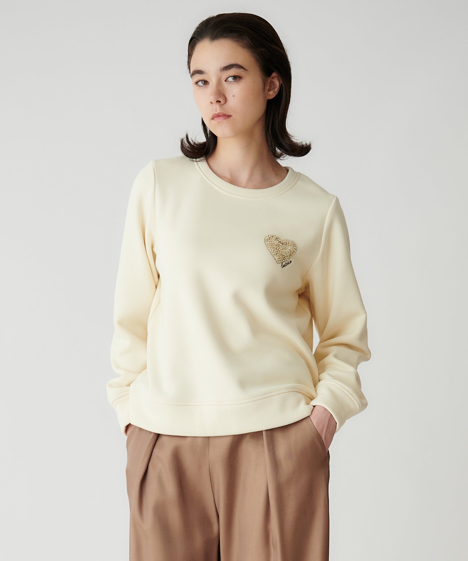 カジュアルなスウェットながら、胸元のモチーフで女性らしく上品に着られます。