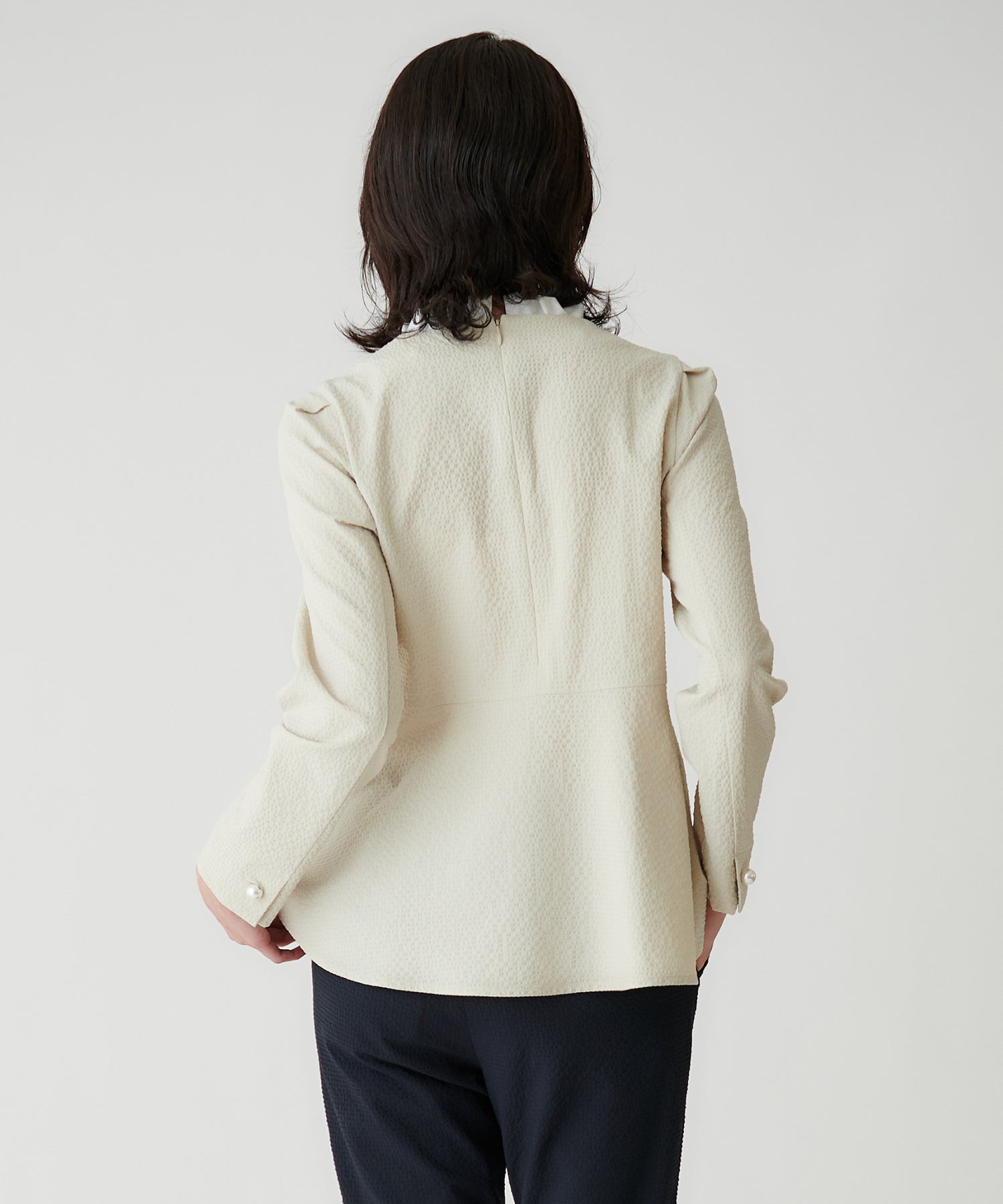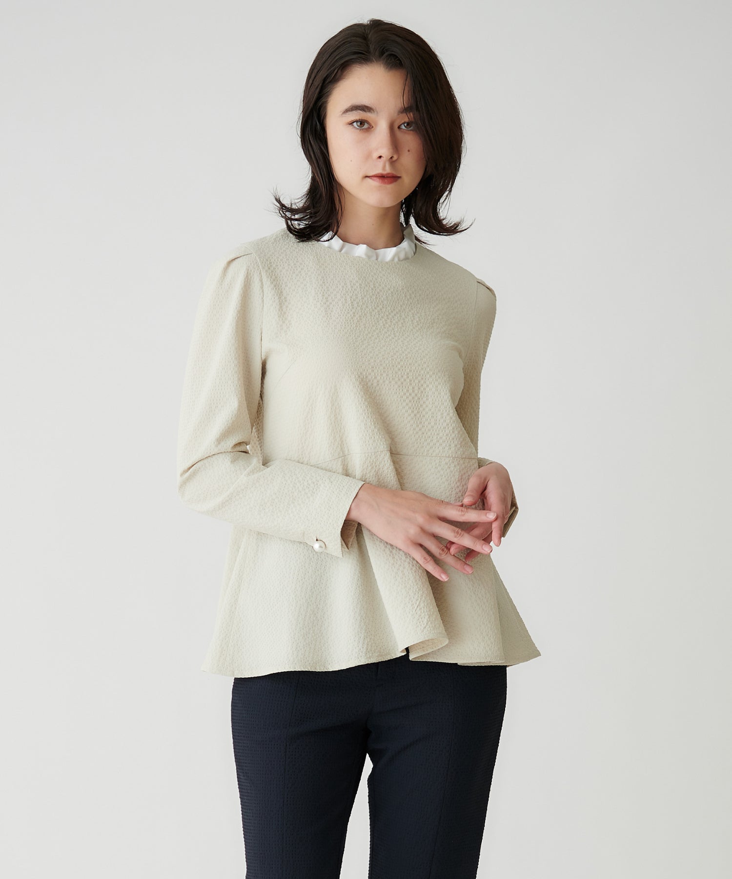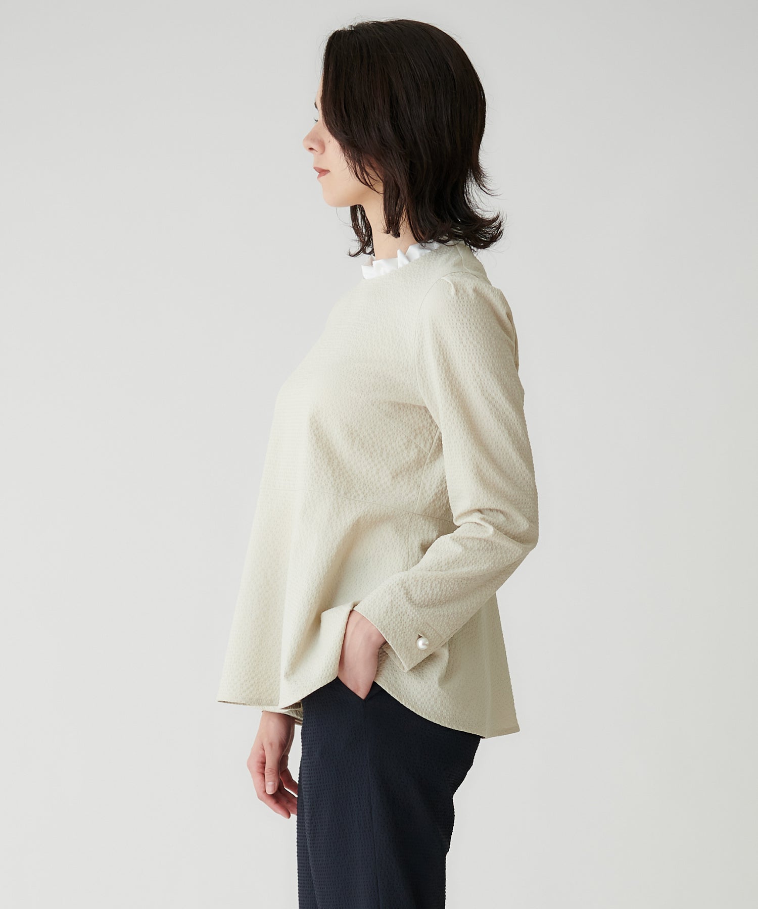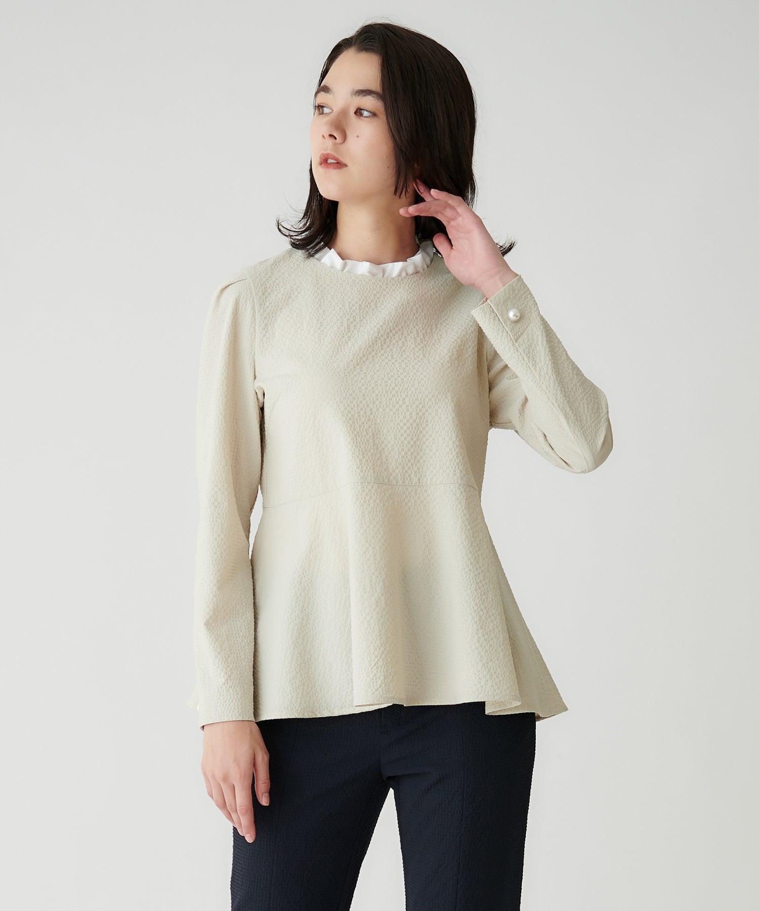 コーディネートに華やかさを添えるフリルカラーブラウス。
