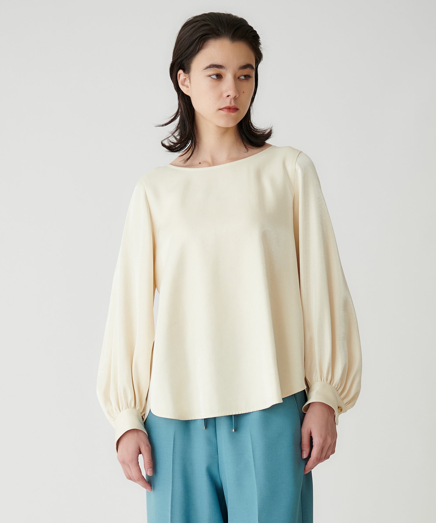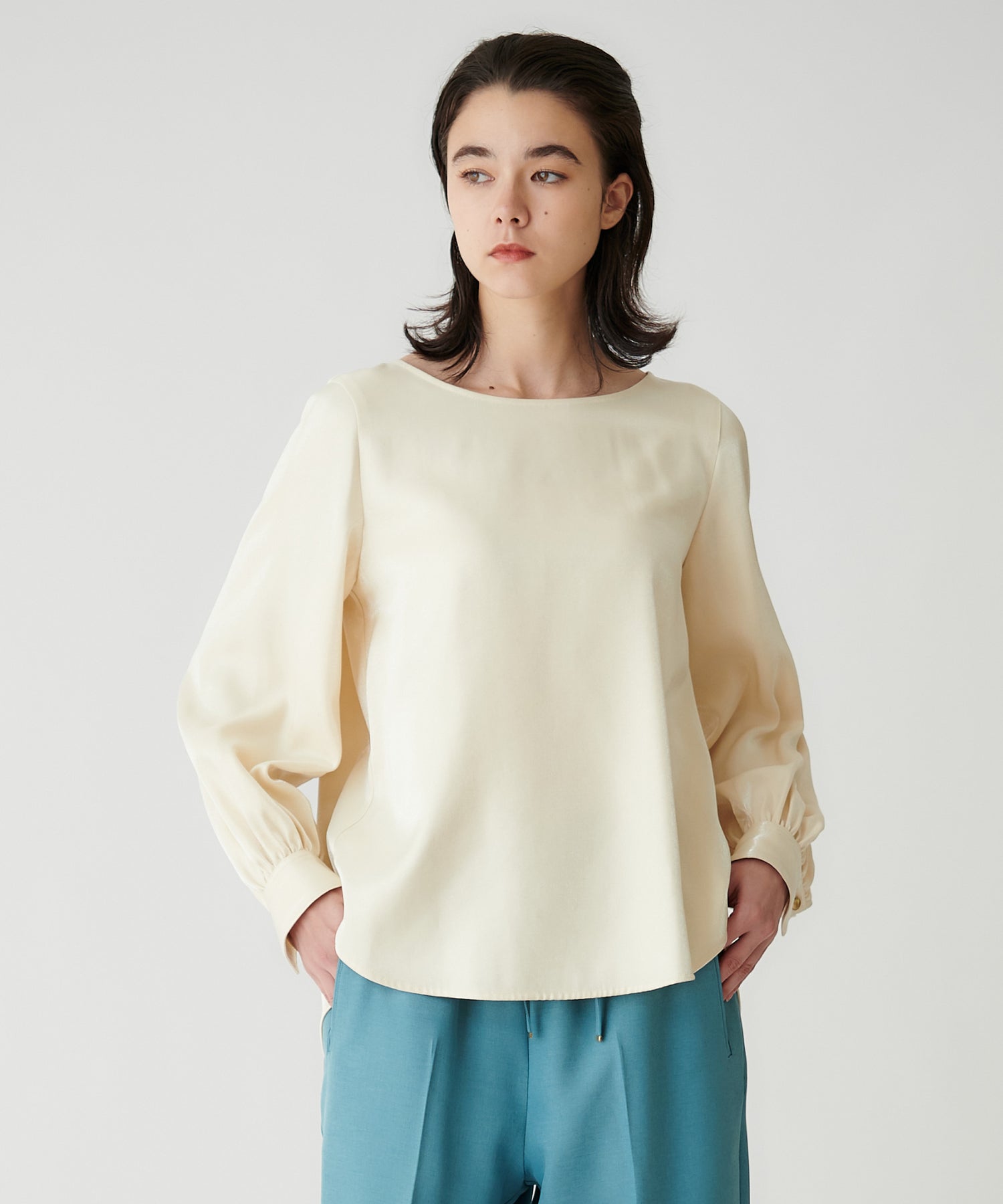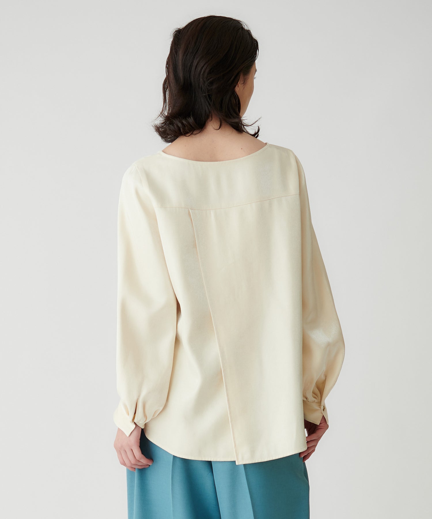 ミニマルなシルエットに、袖のふんわりとしたボリュームが映えるプルオーバーブラウス。上品なデザインながら、バックスタイルにもさりげなく表情があり、一枚できちんと感とこなれた雰囲気を演出します。