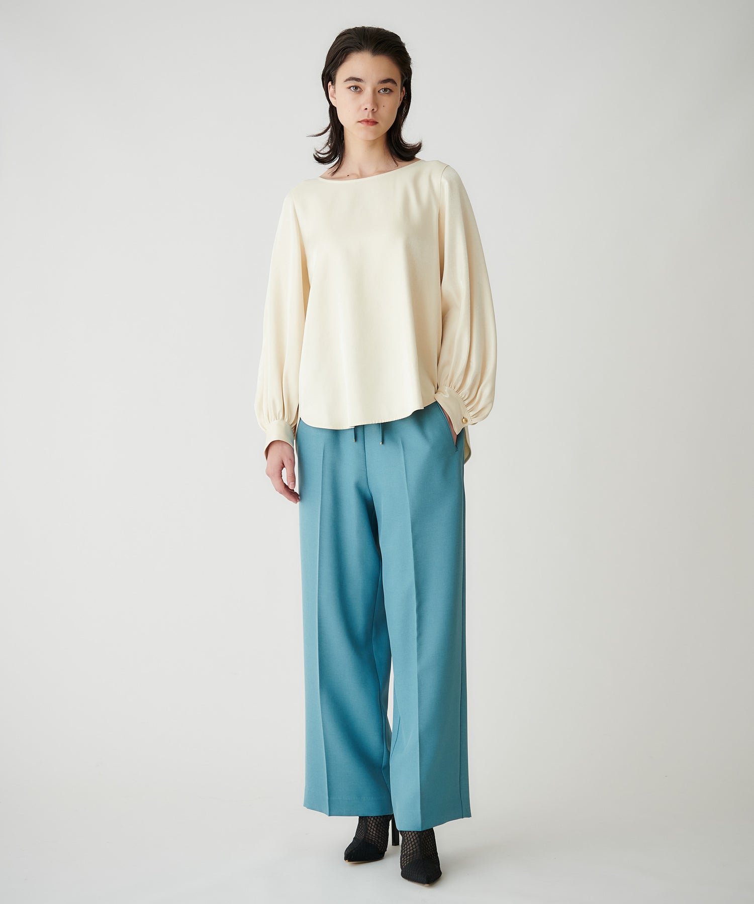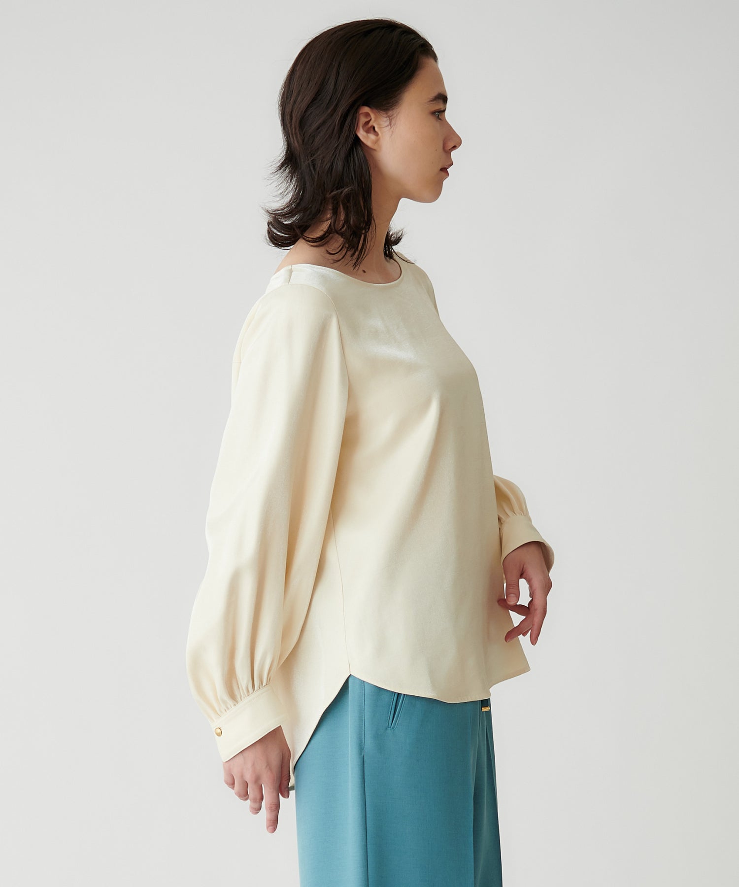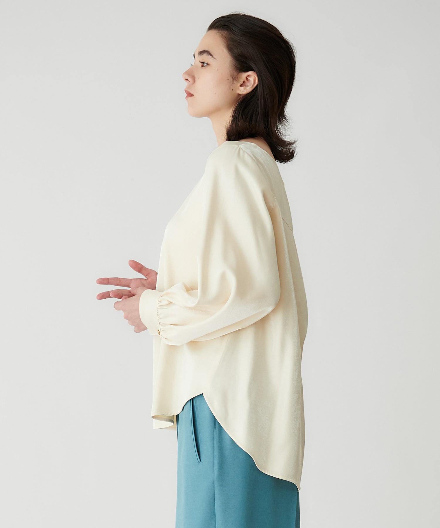 ミニマルなシルエットに、袖のふんわりとしたボリュームが映えるプルオーバーブラウス。上品なデザインながら、バックスタイルにもさりげなく表情があり、一枚できちんと感とこなれた雰囲気を演出します。