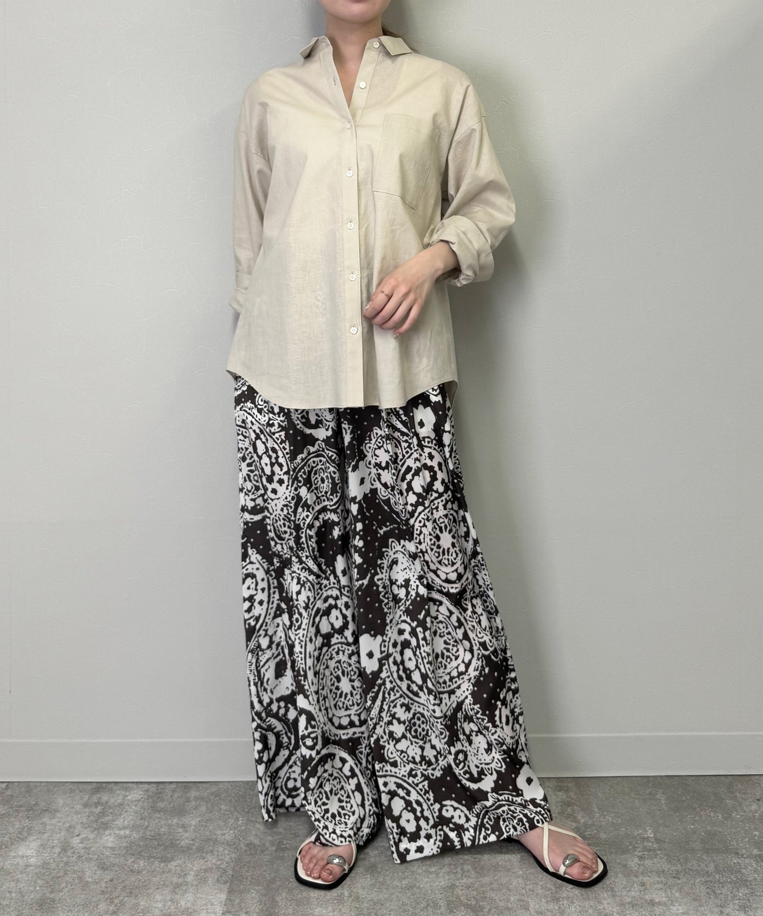 ワイドパンツと組み合わせて、リラックス感たっぷりのスタイリッシュなルックを演出します。