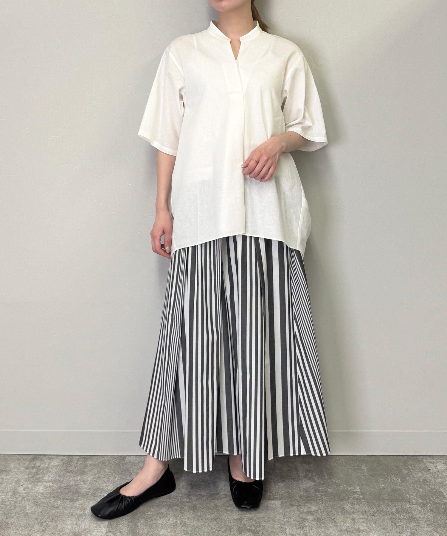後ろにほんのりドレープを入れて着用するとふわっと膨らむ肌離れの良いチュニックです。真夏に活躍するヘビロテアイテムです。