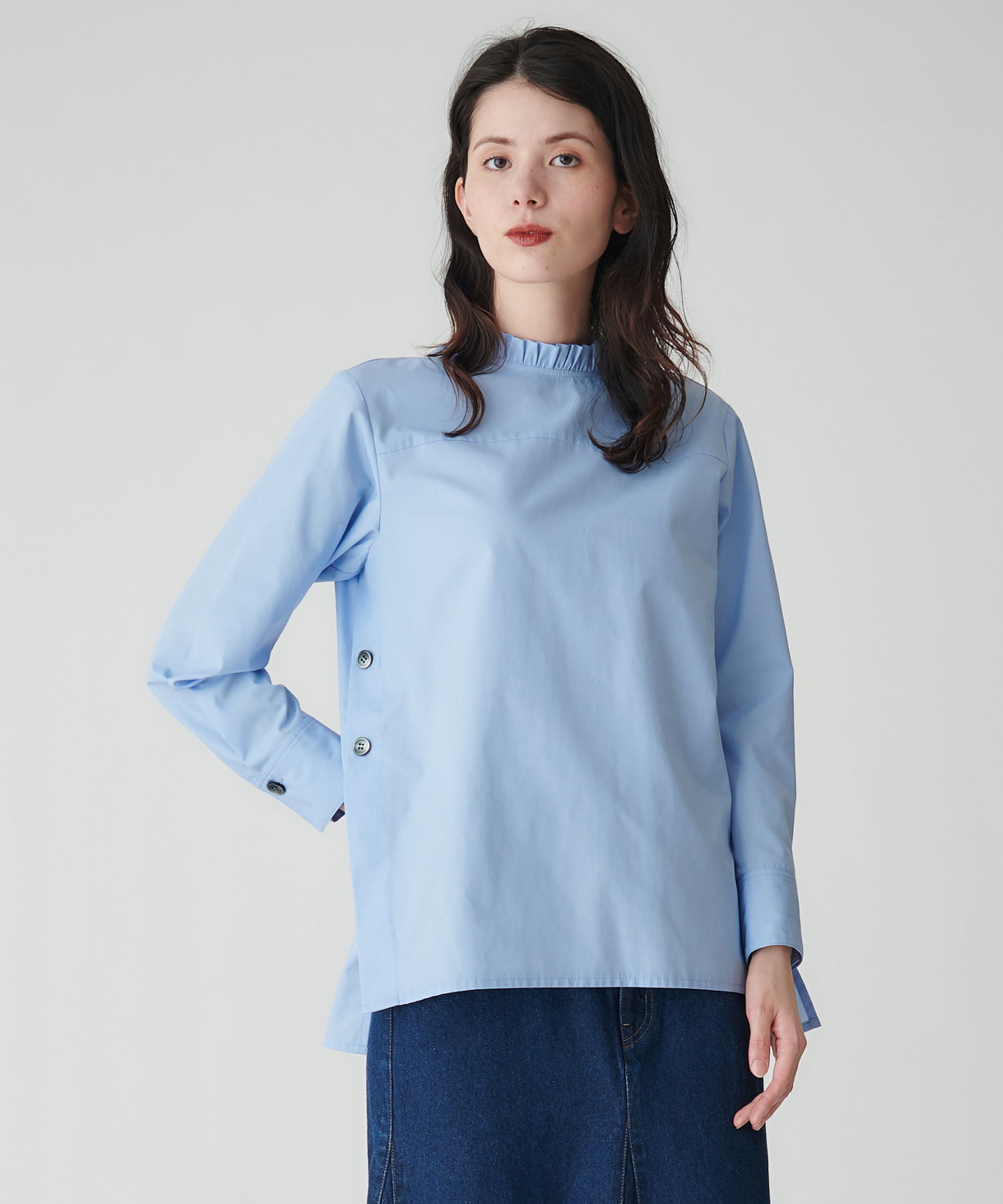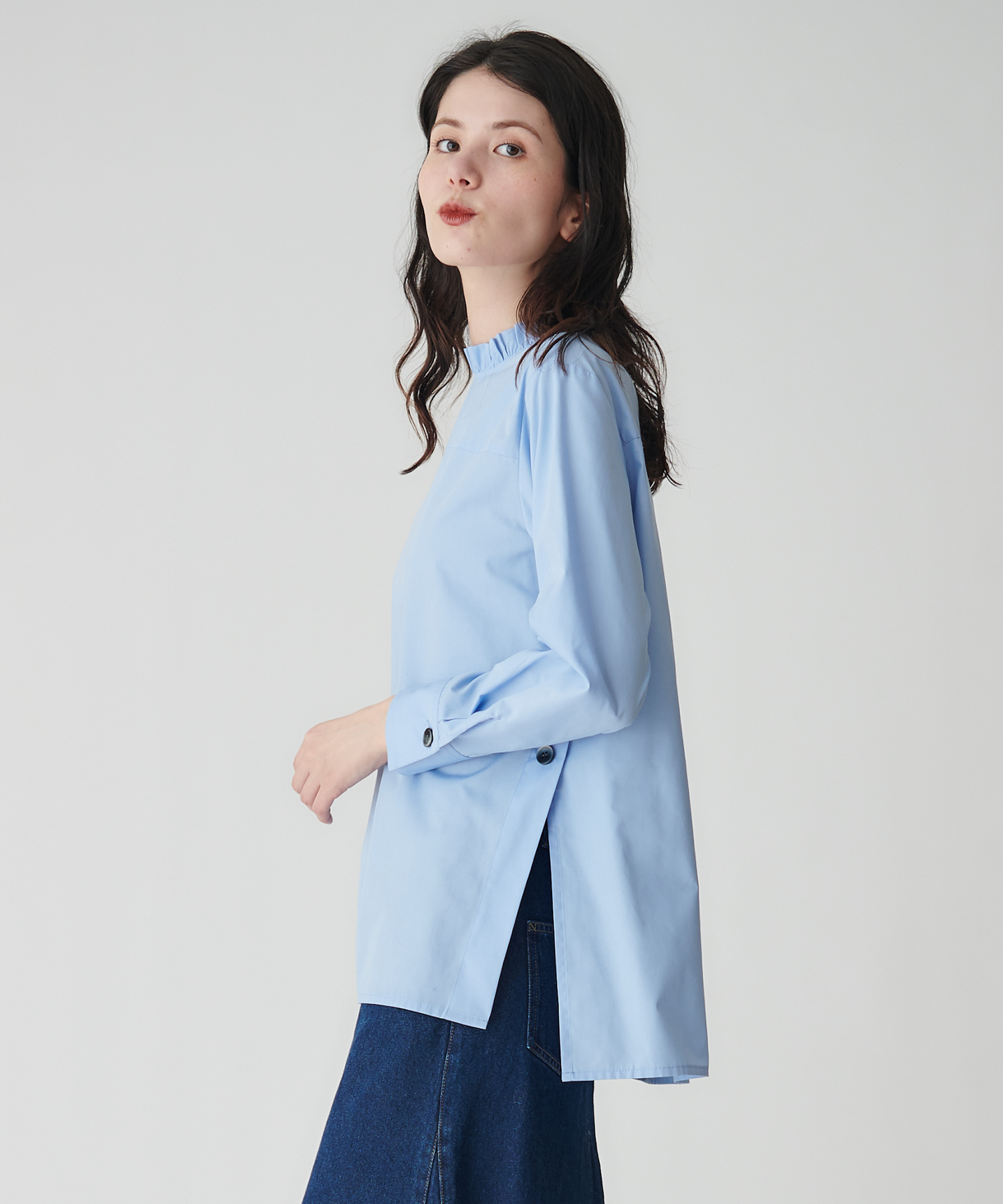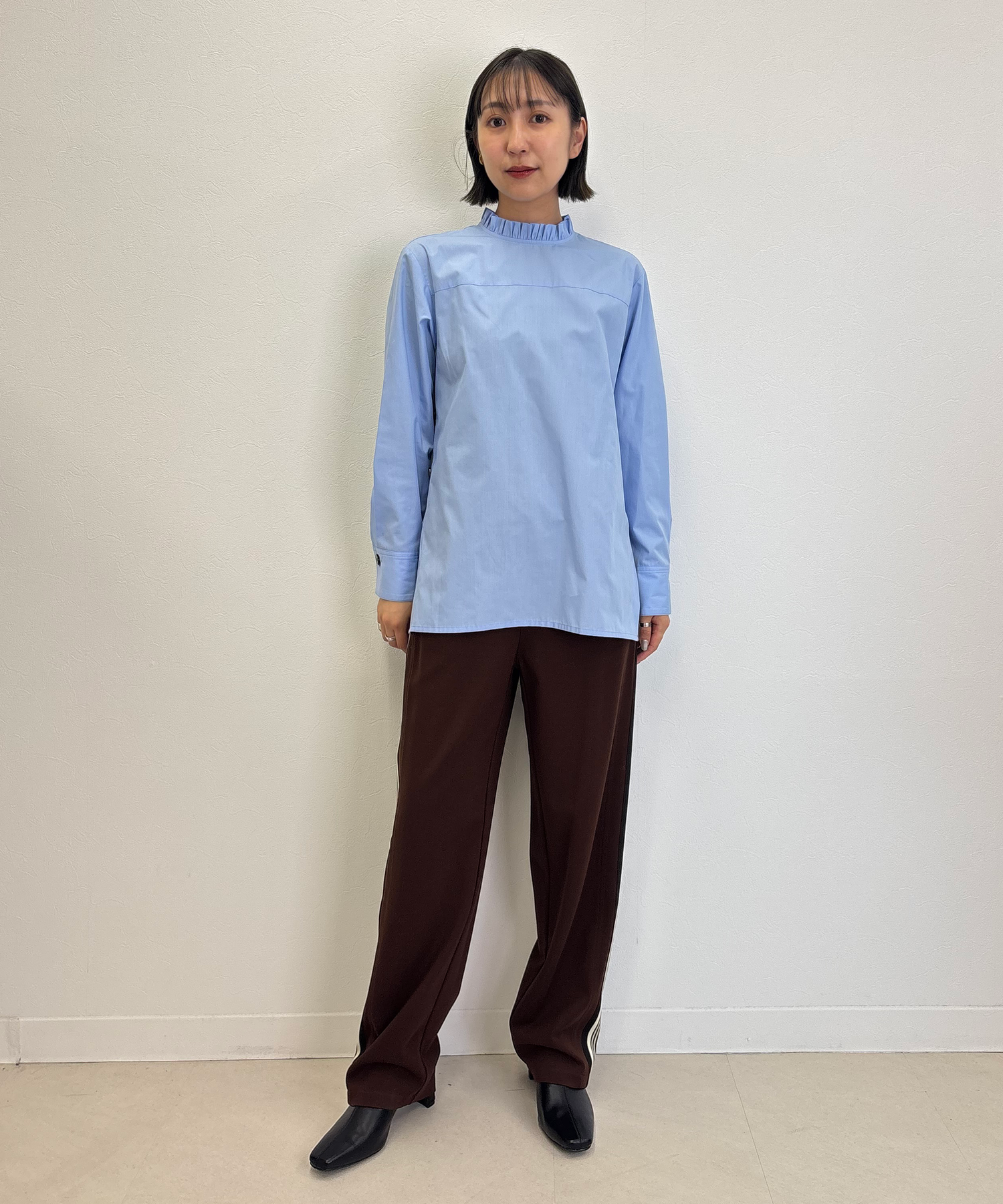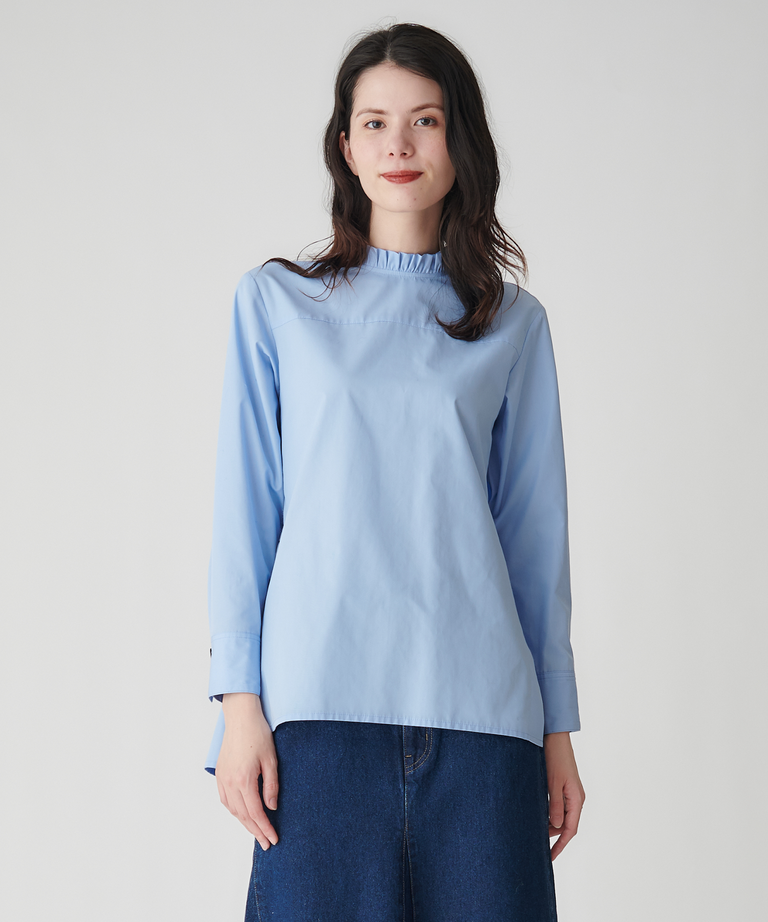 首元に沿うフリルカラーが華やかさを添え、シンプルながらも女性らしいポイントをプラスしています。1枚で着てもレイヤードスタイルでも存在感を発揮する、着回し力の高いアイテムです。