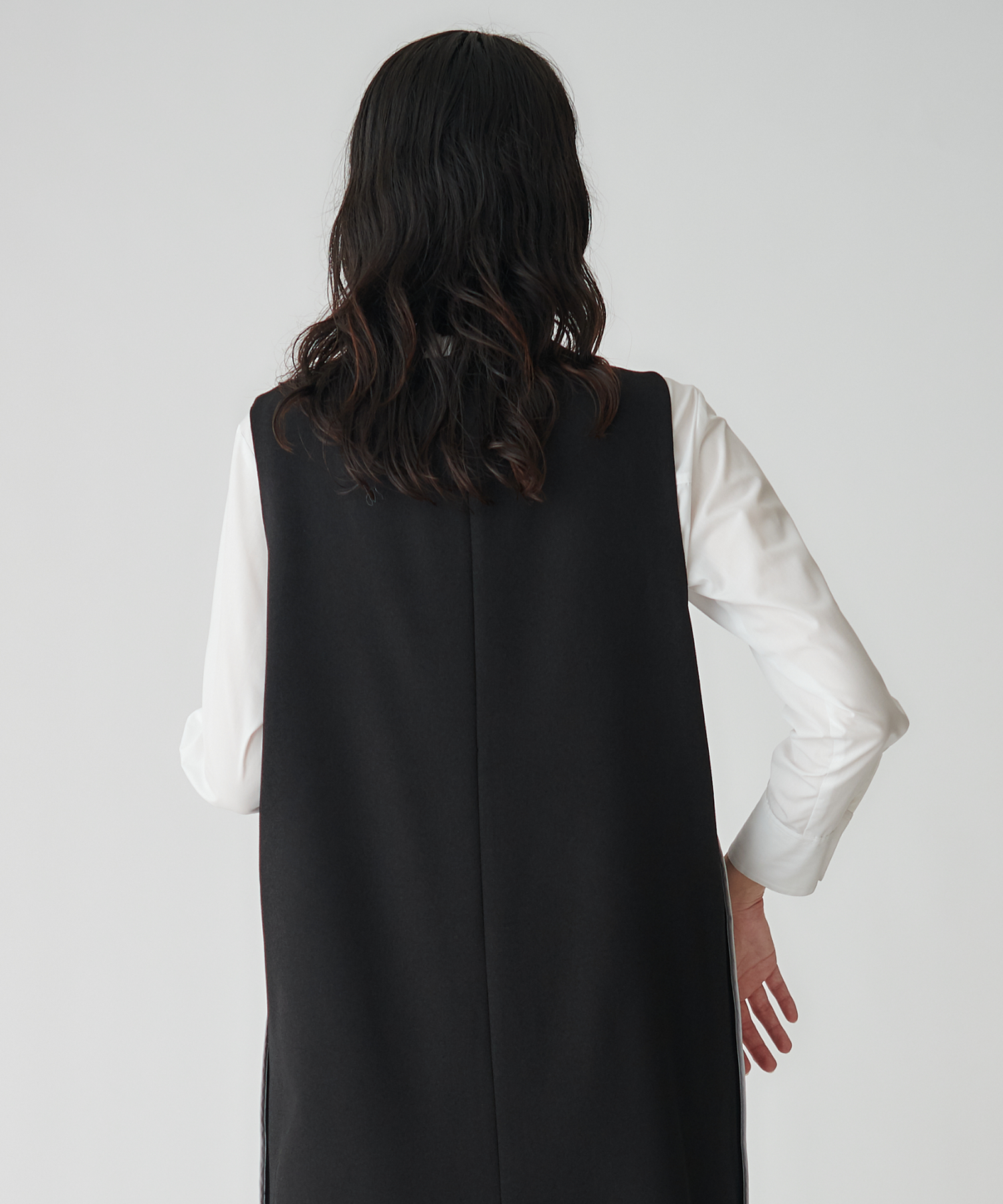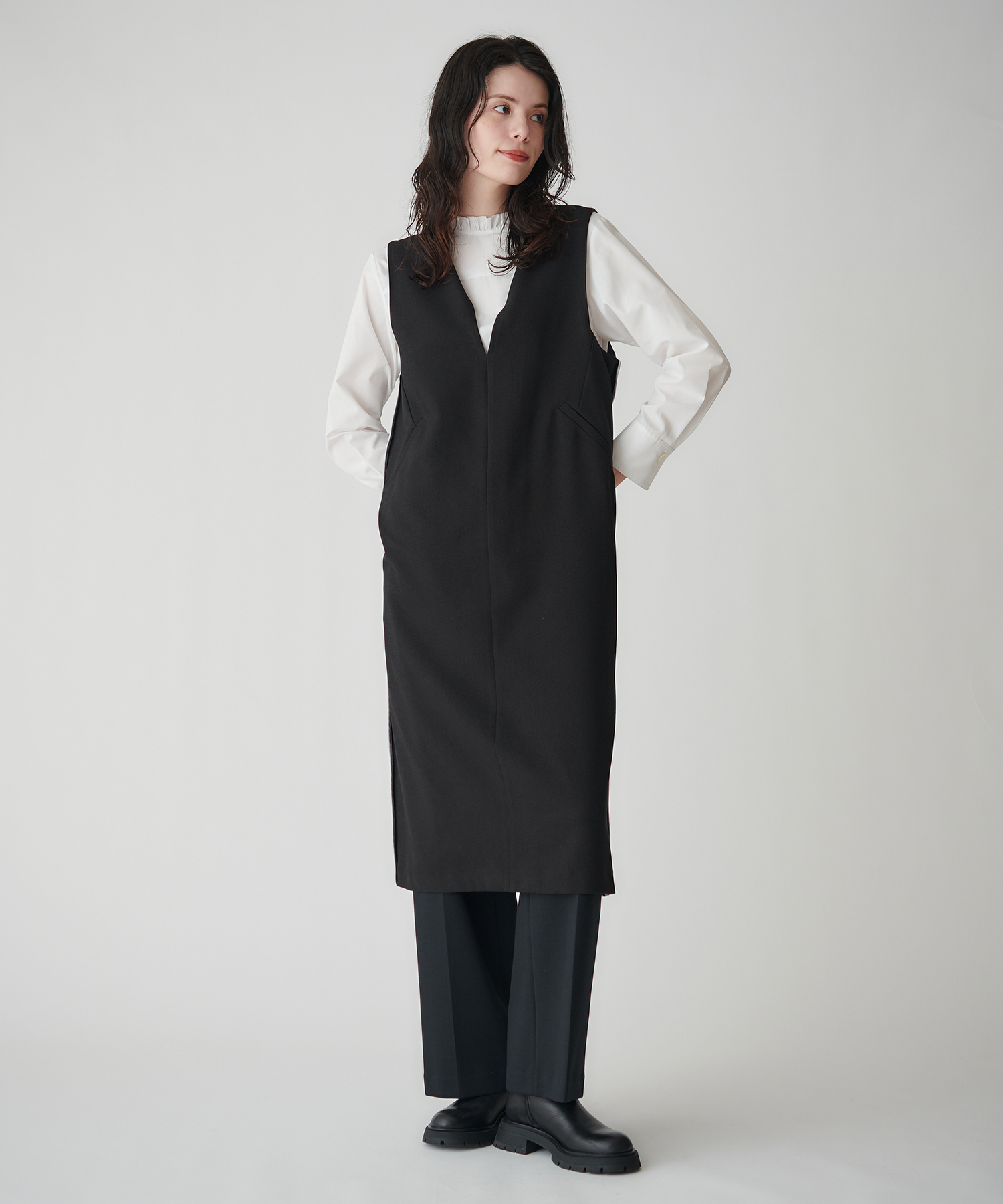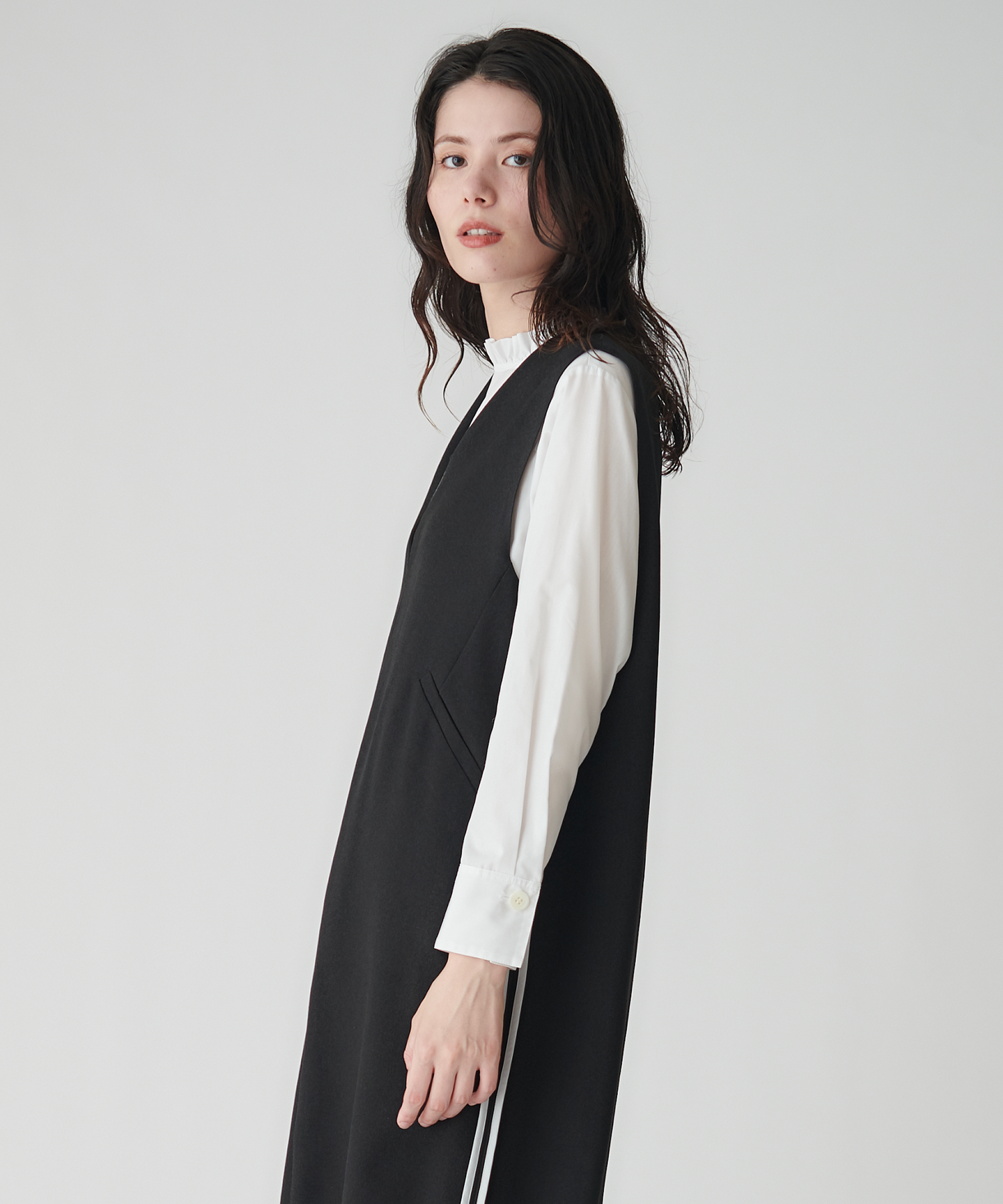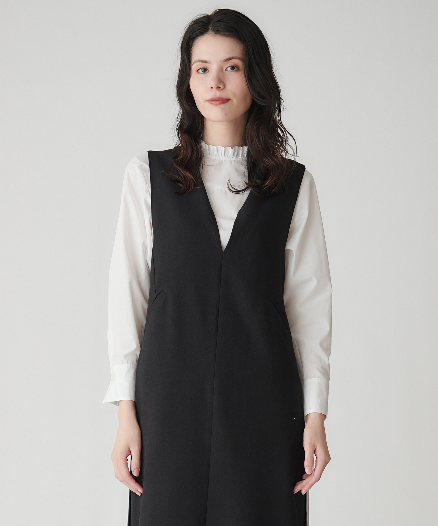 首元に沿うフリルカラーが華やかさを添え、シンプルながらも女性らしいポイントをプラスしています。1枚で着てもレイヤードスタイルでも存在感を発揮する、着回し力の高いアイテムです。