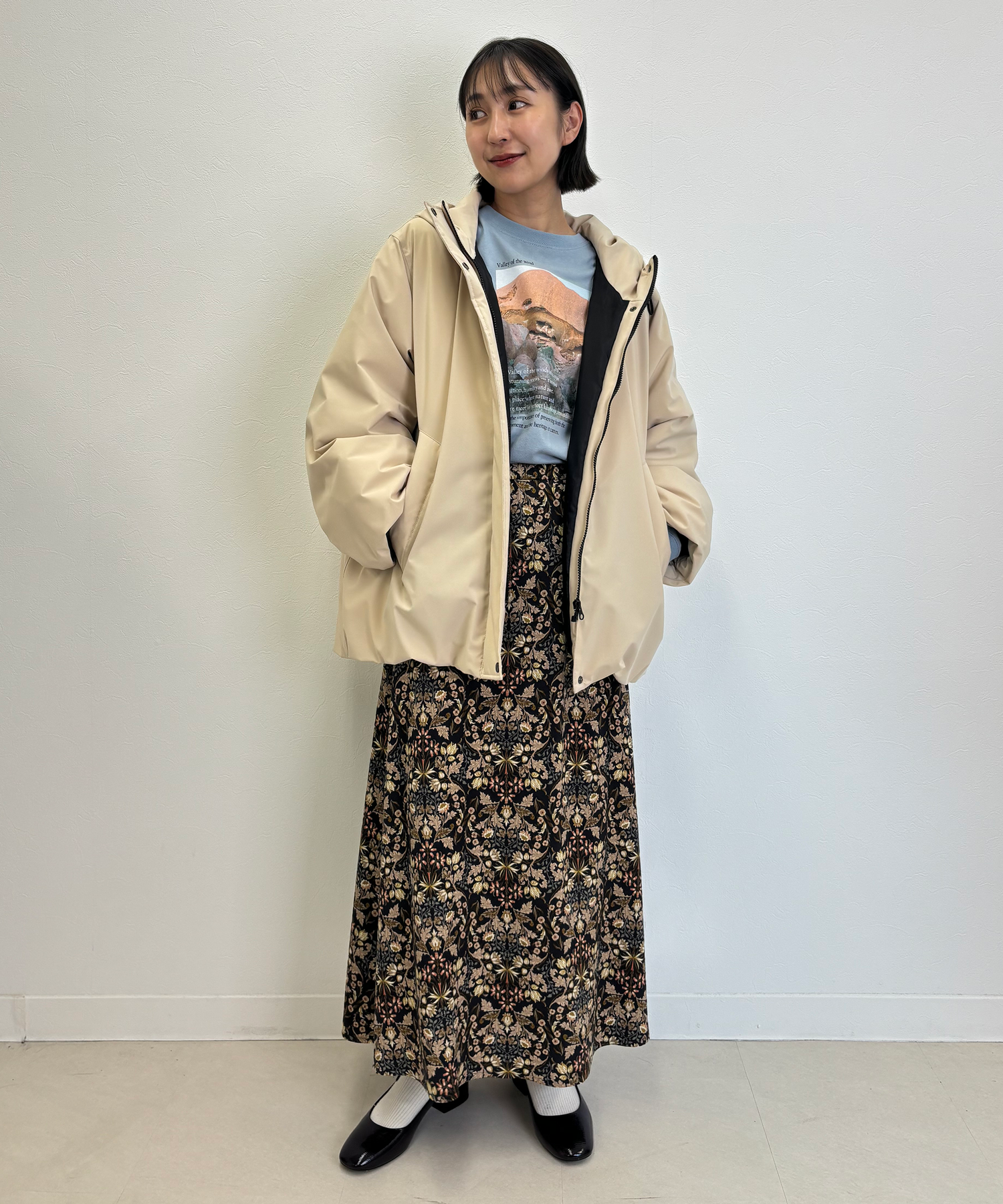 柄を主役にシンプルな無地トップスと合わせれば、大人フェミニンなコーディネートに。