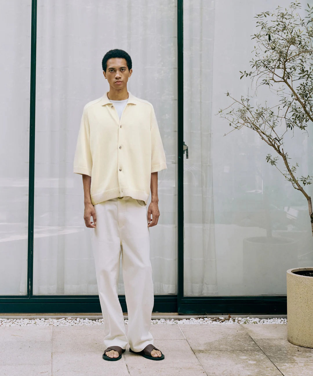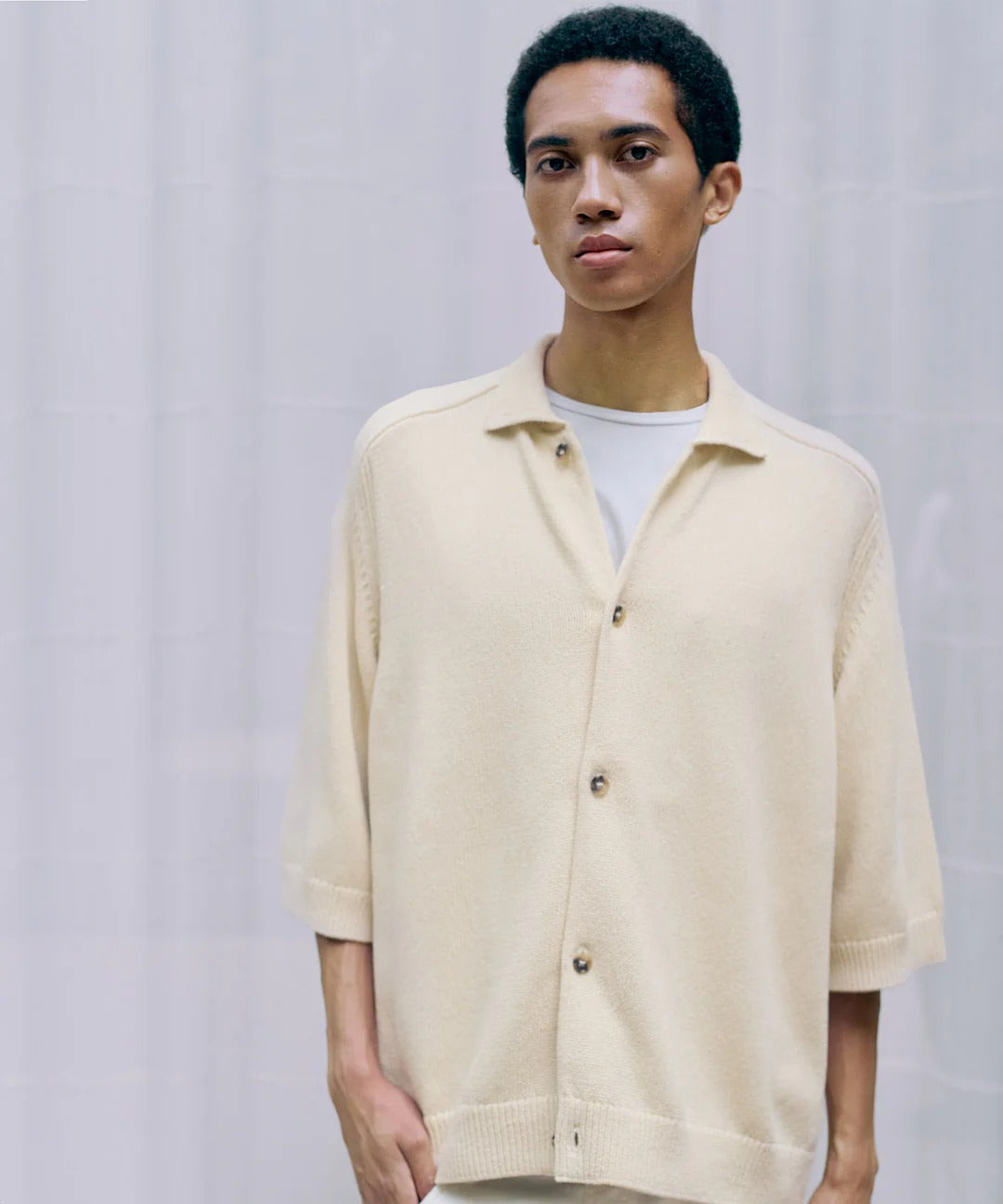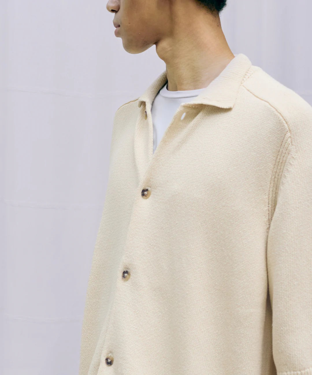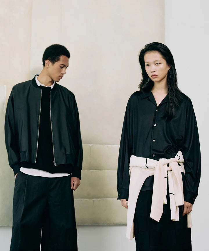 尾州に1台しかない真空圧縮の機械による仕上げを施すことで原料の風合いを最大限引き立ている、Super160'sウールを使用したハイゲージジャージ素材のシャツ。