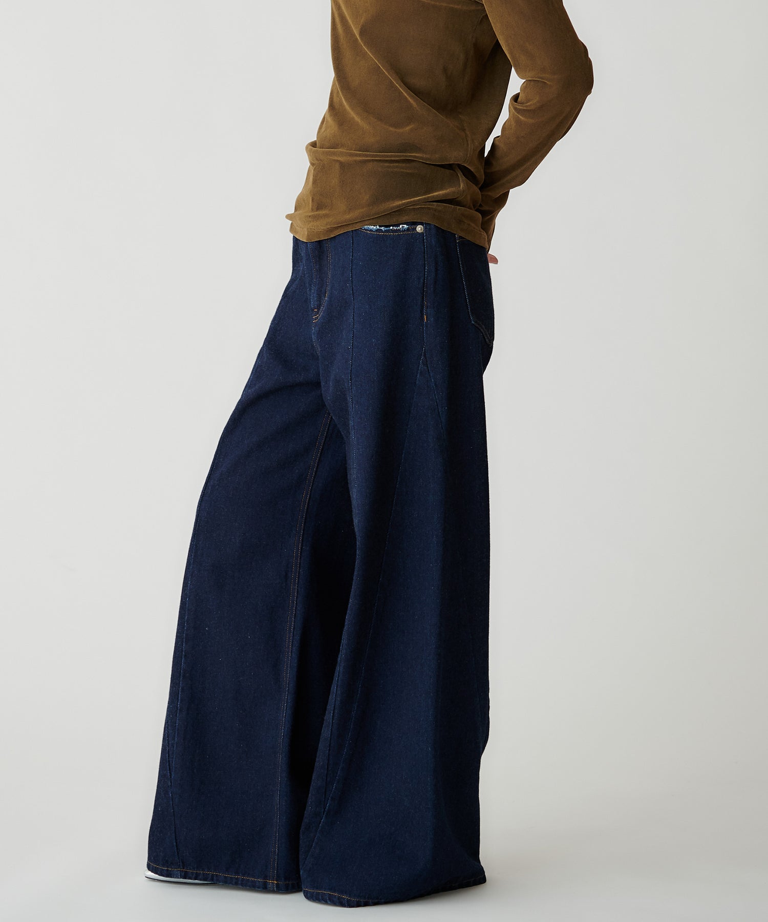 大胆な切り替え配色を引いたデニムパンツ。
