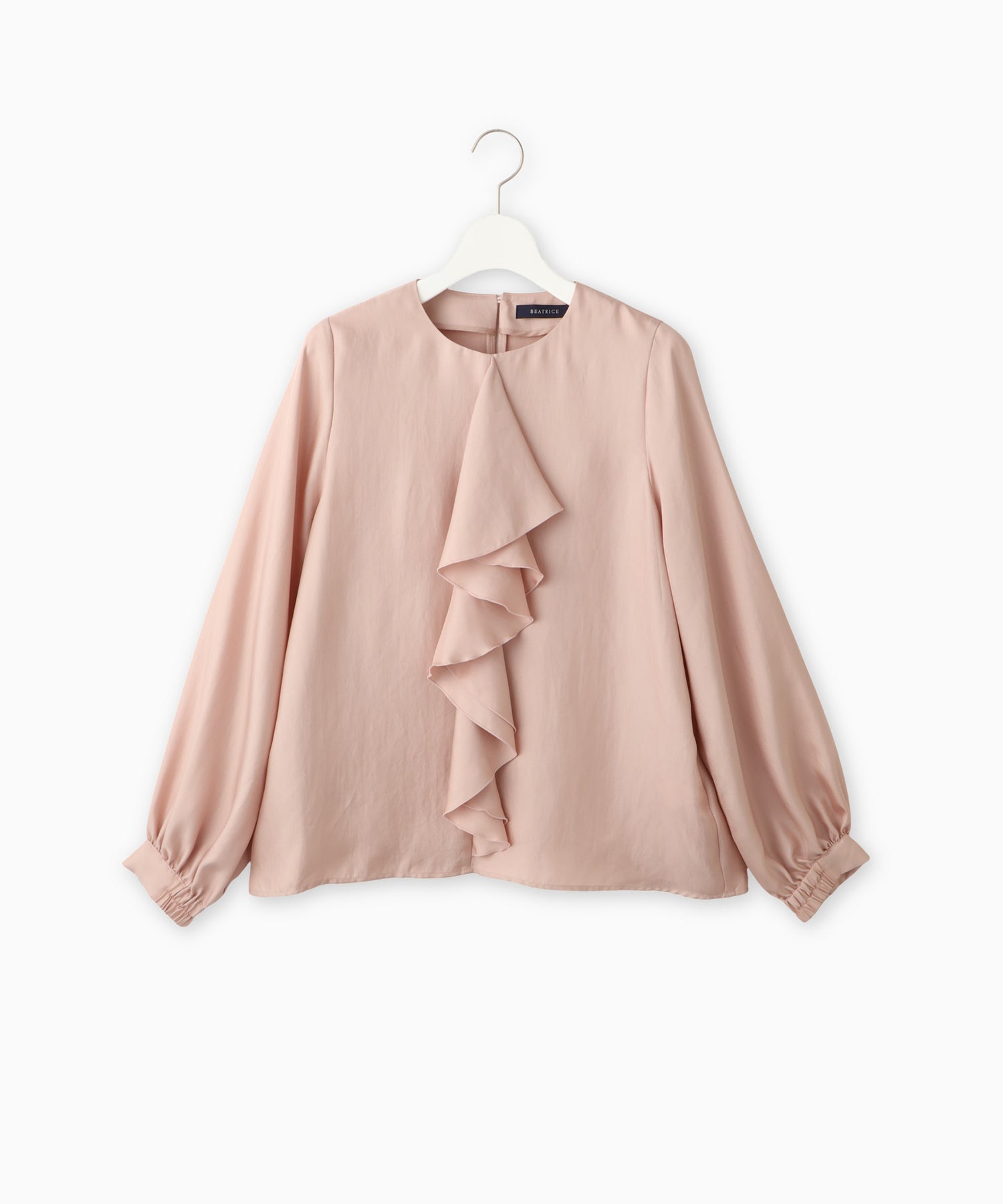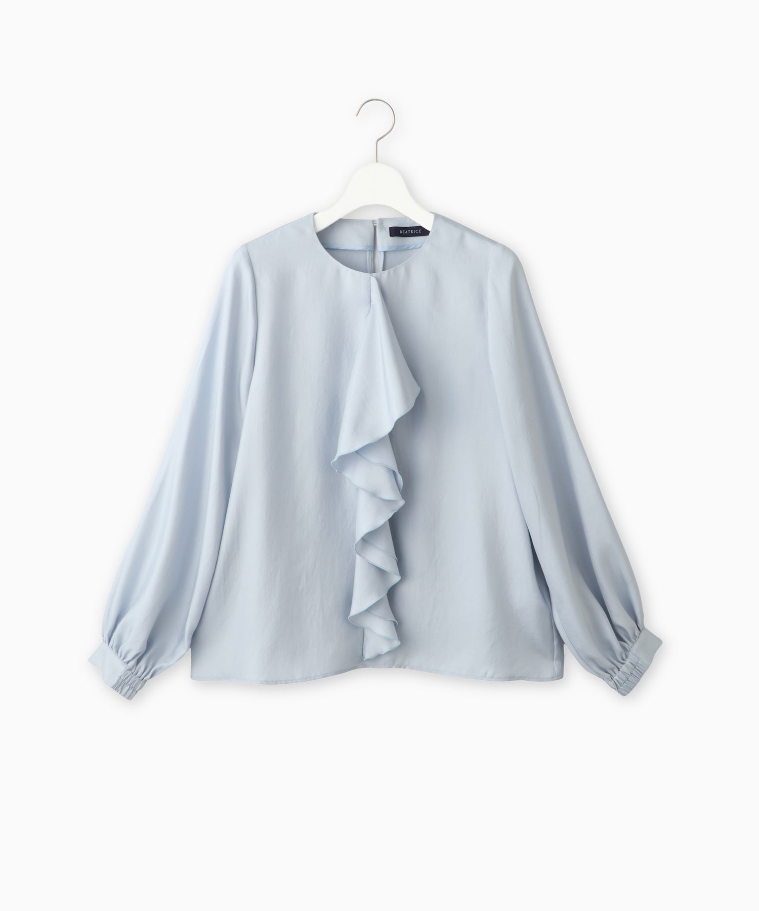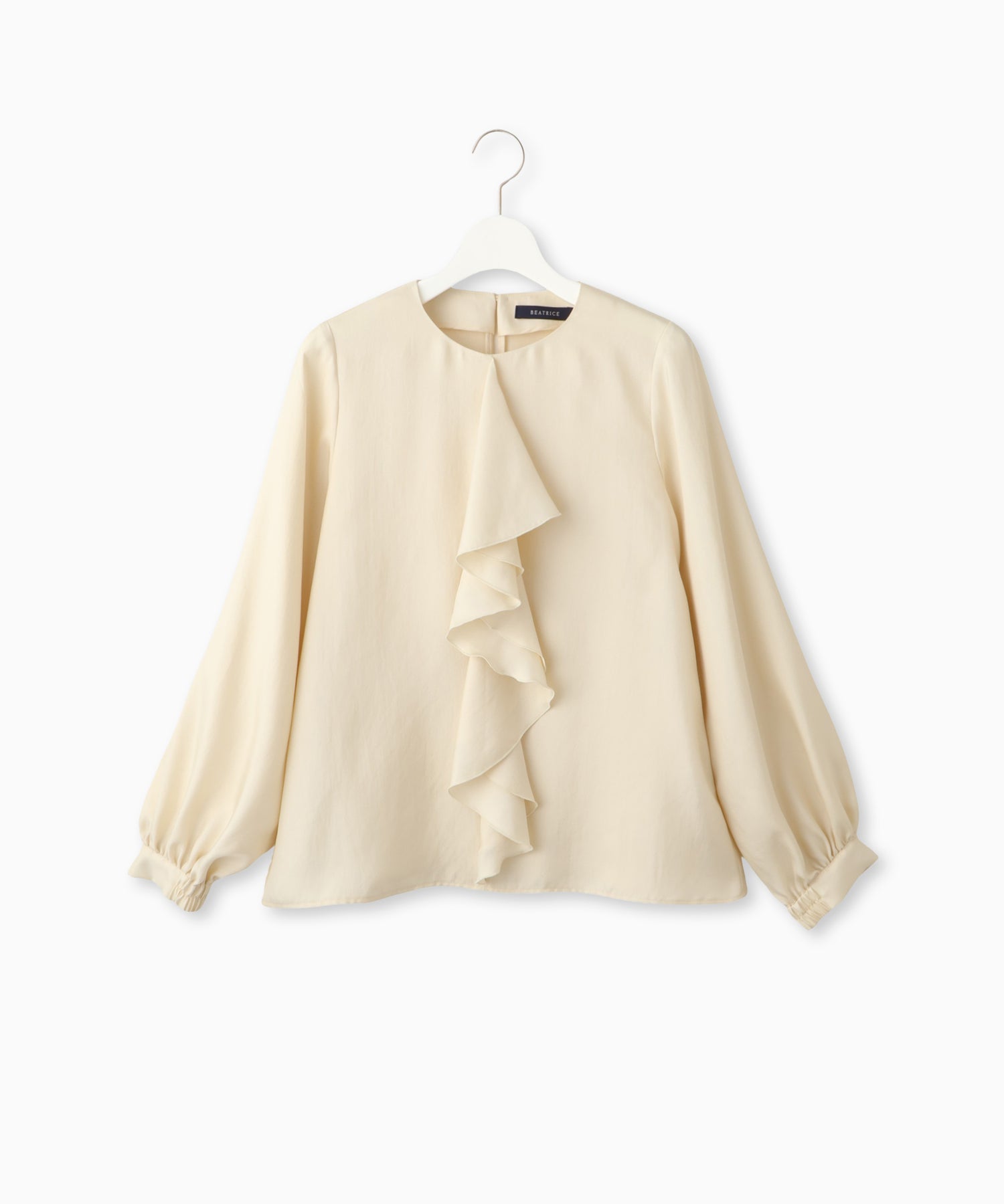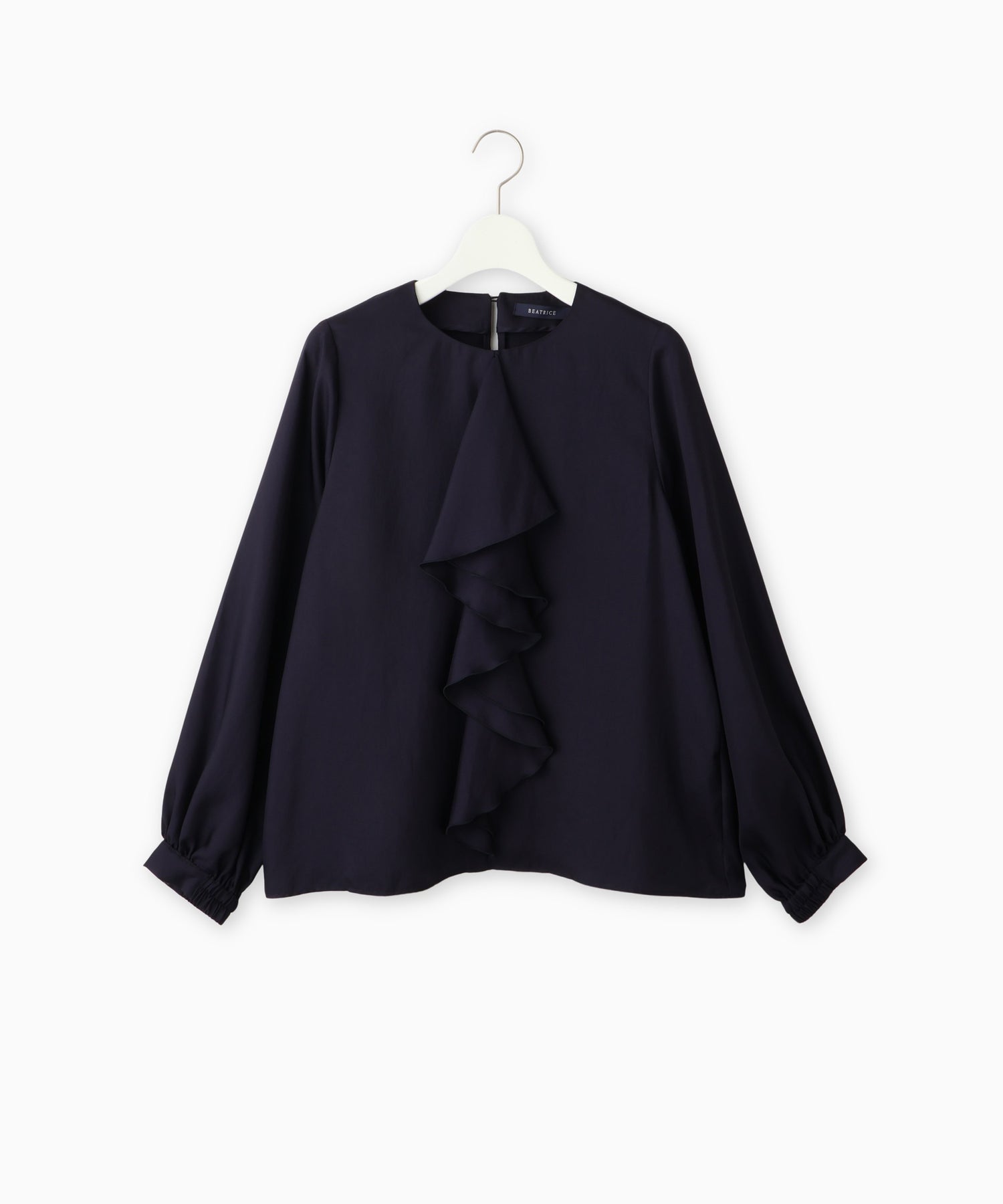 フロントのラッフルが目を惹くデザインブラウス。