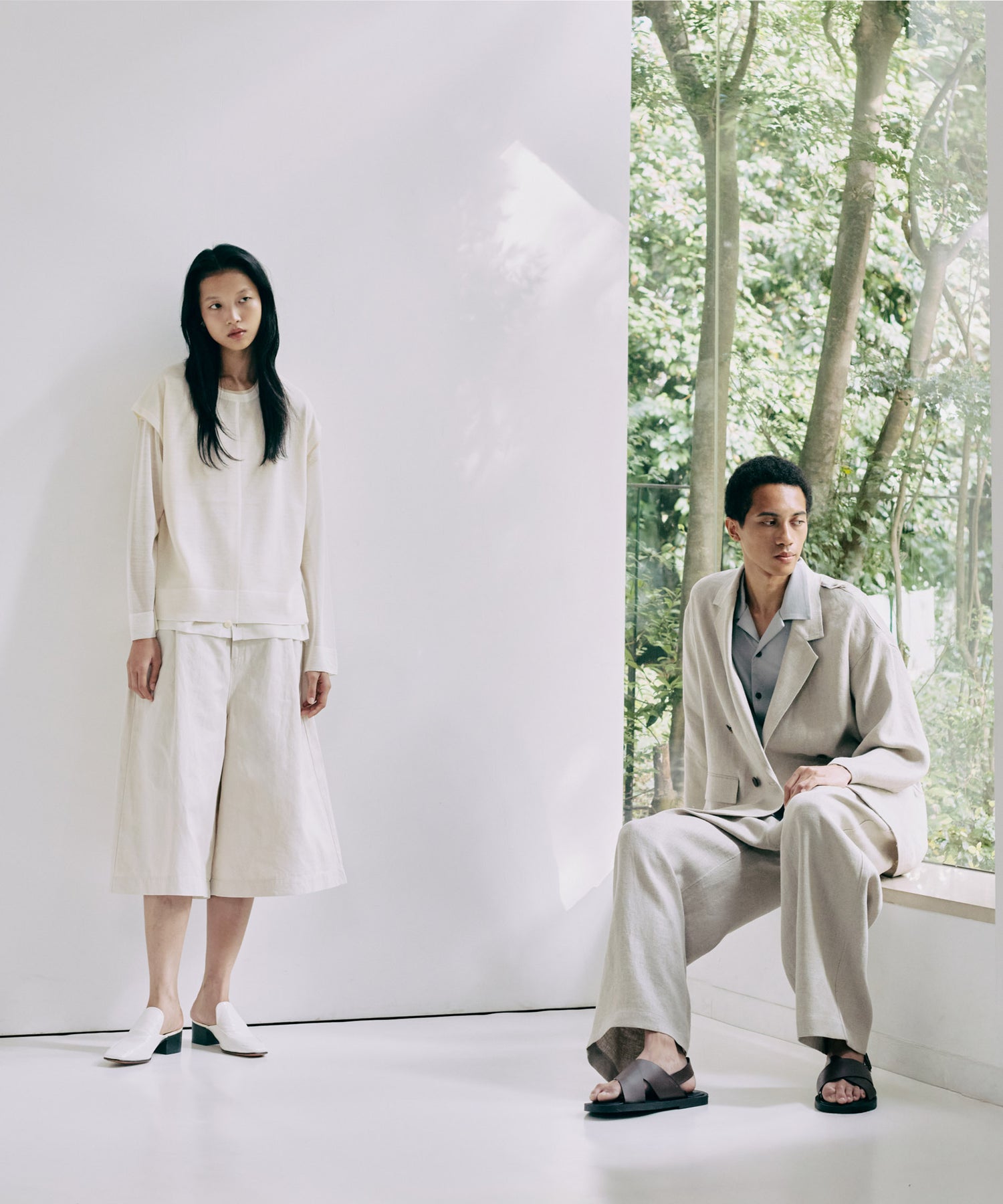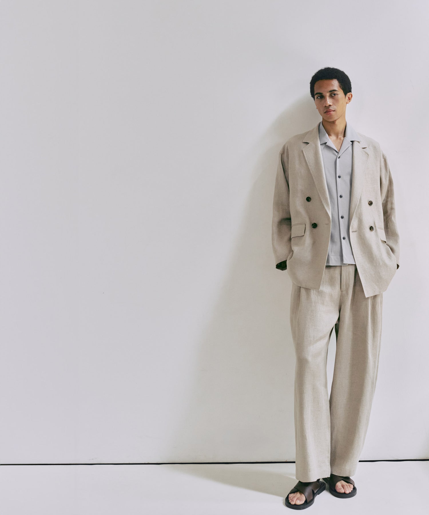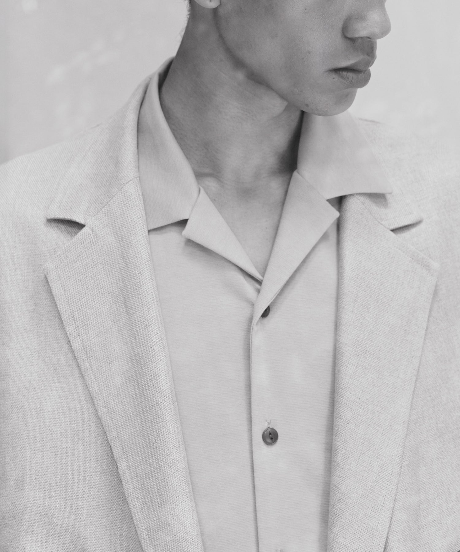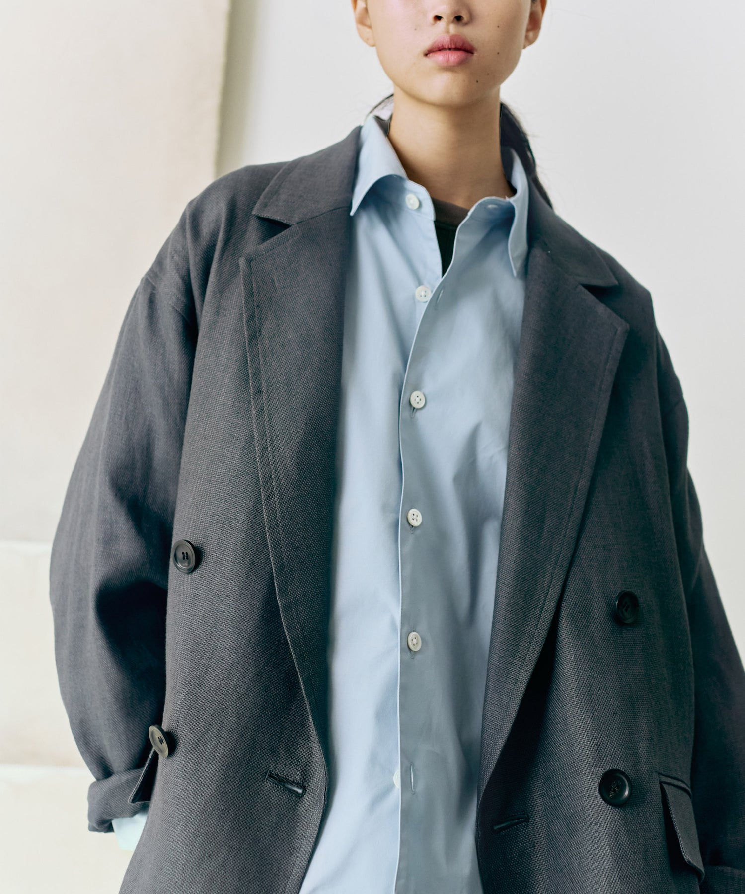 太番リネンを高密度に打ち込んだオックス素材。上質なリネンによる光沢感と高密度感が、カジュアルなリネンとは一線を画すラグジュアリーな雰囲気を醸し出しています。