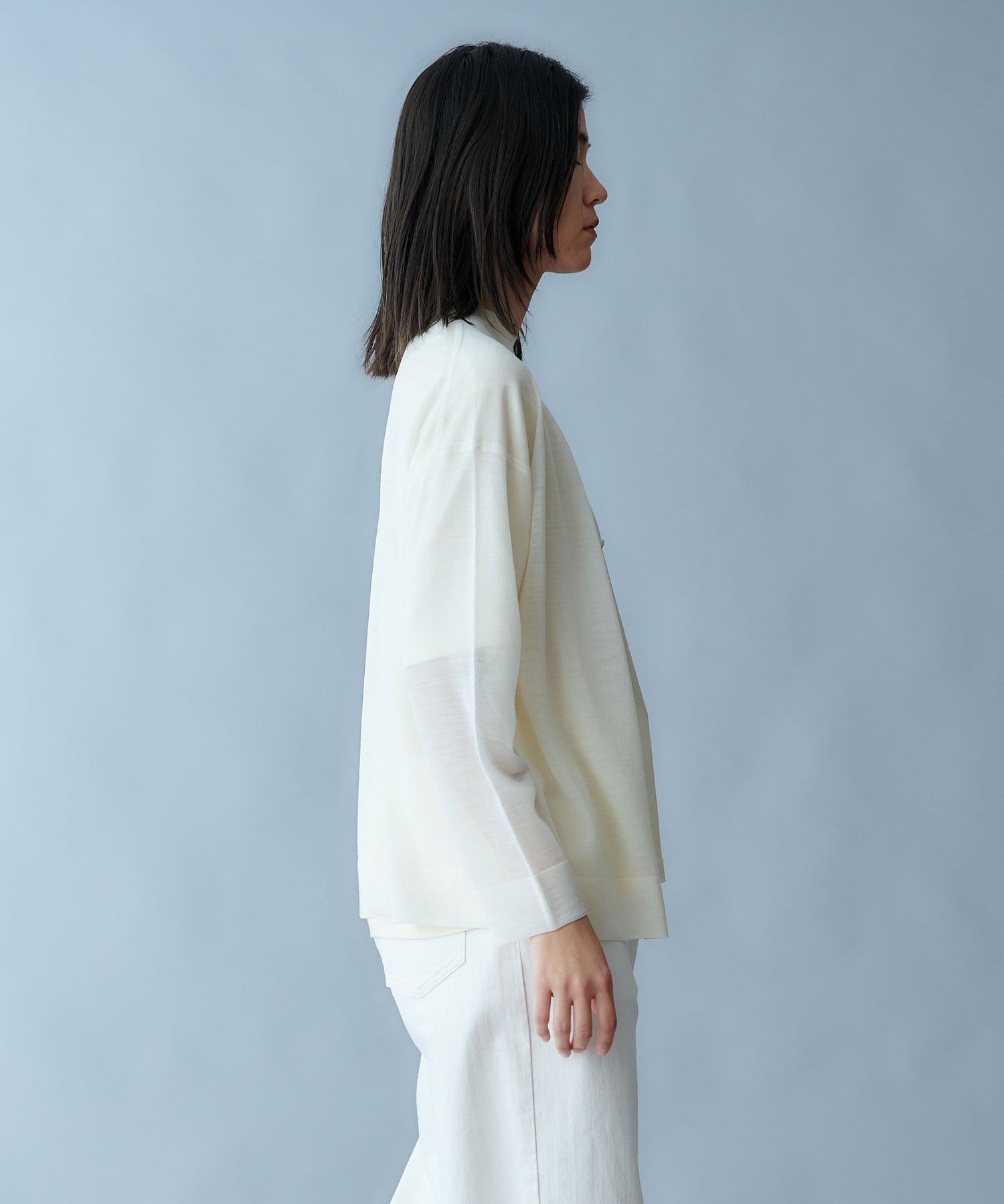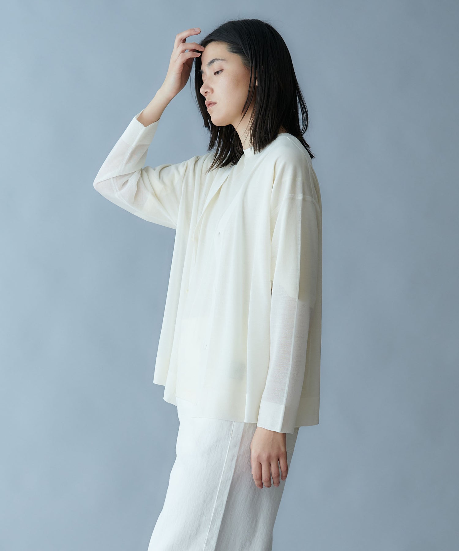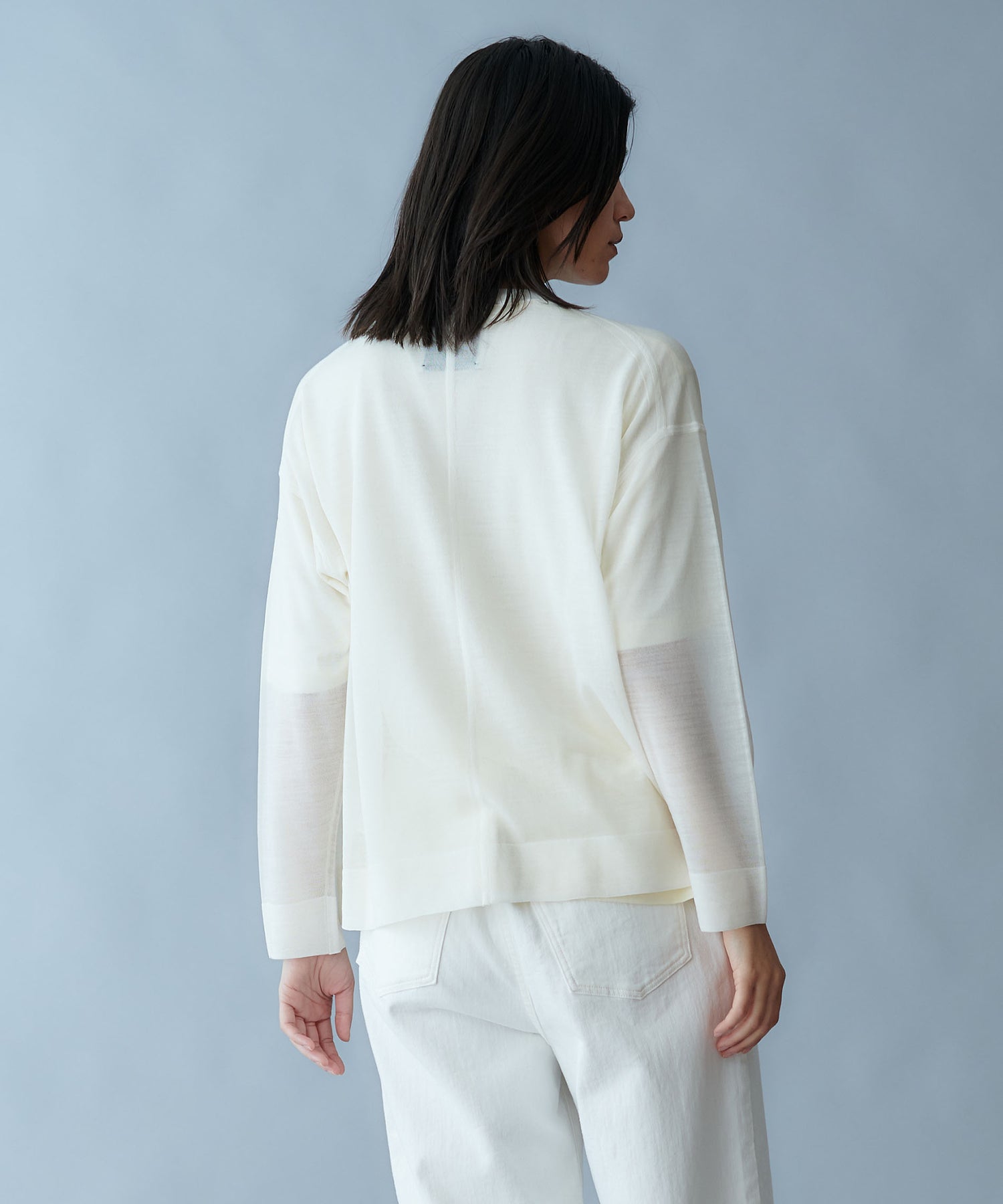 細番手の梳毛ウールとシルクを組み合わせた高品質の糸を、度目を詰め過ぎずに編み立てることで、シアー感を表現したシリーズです。