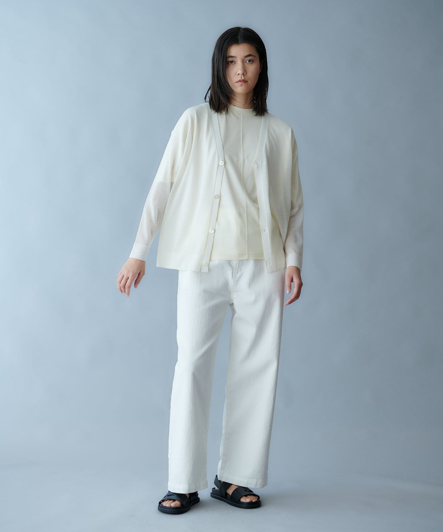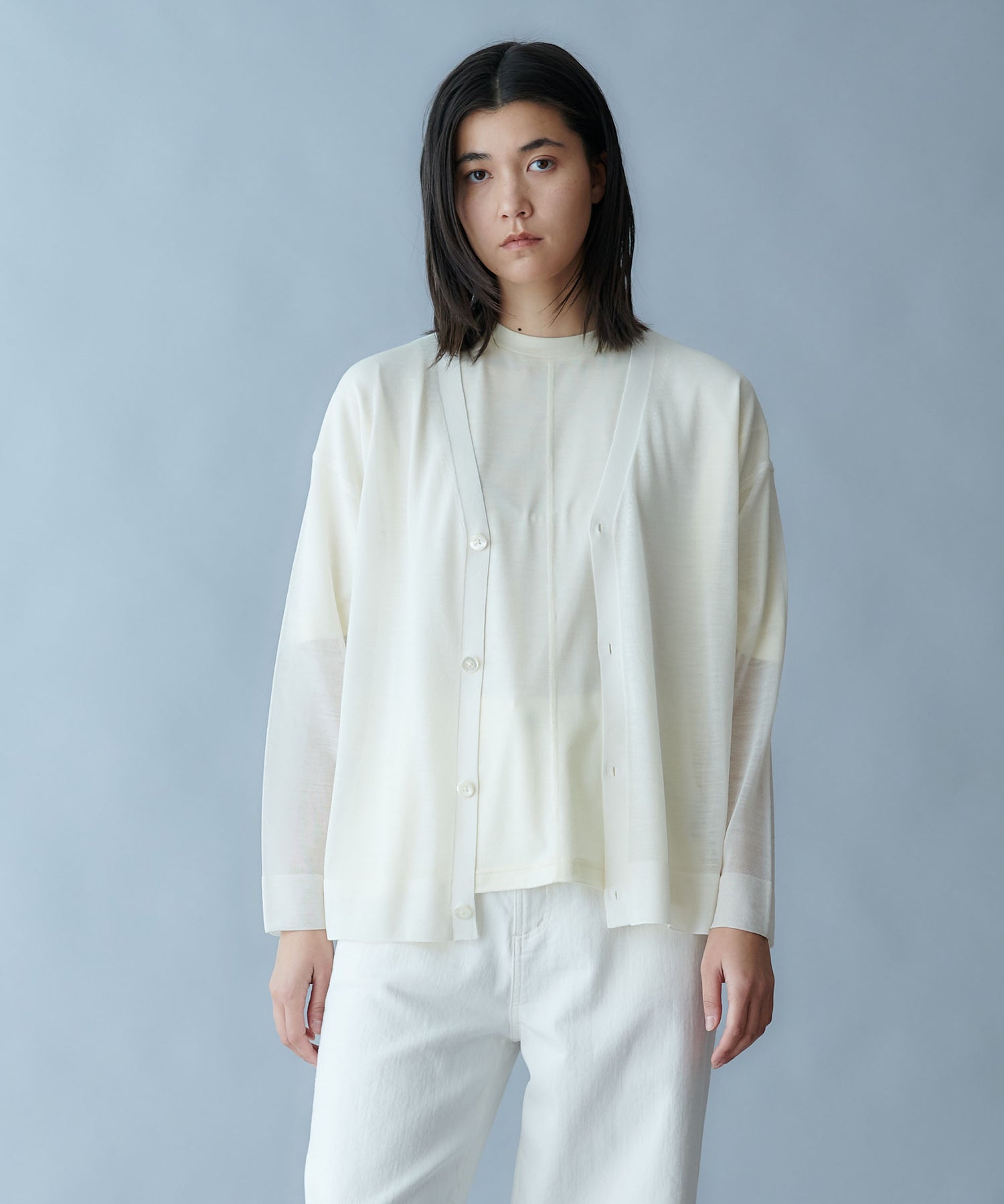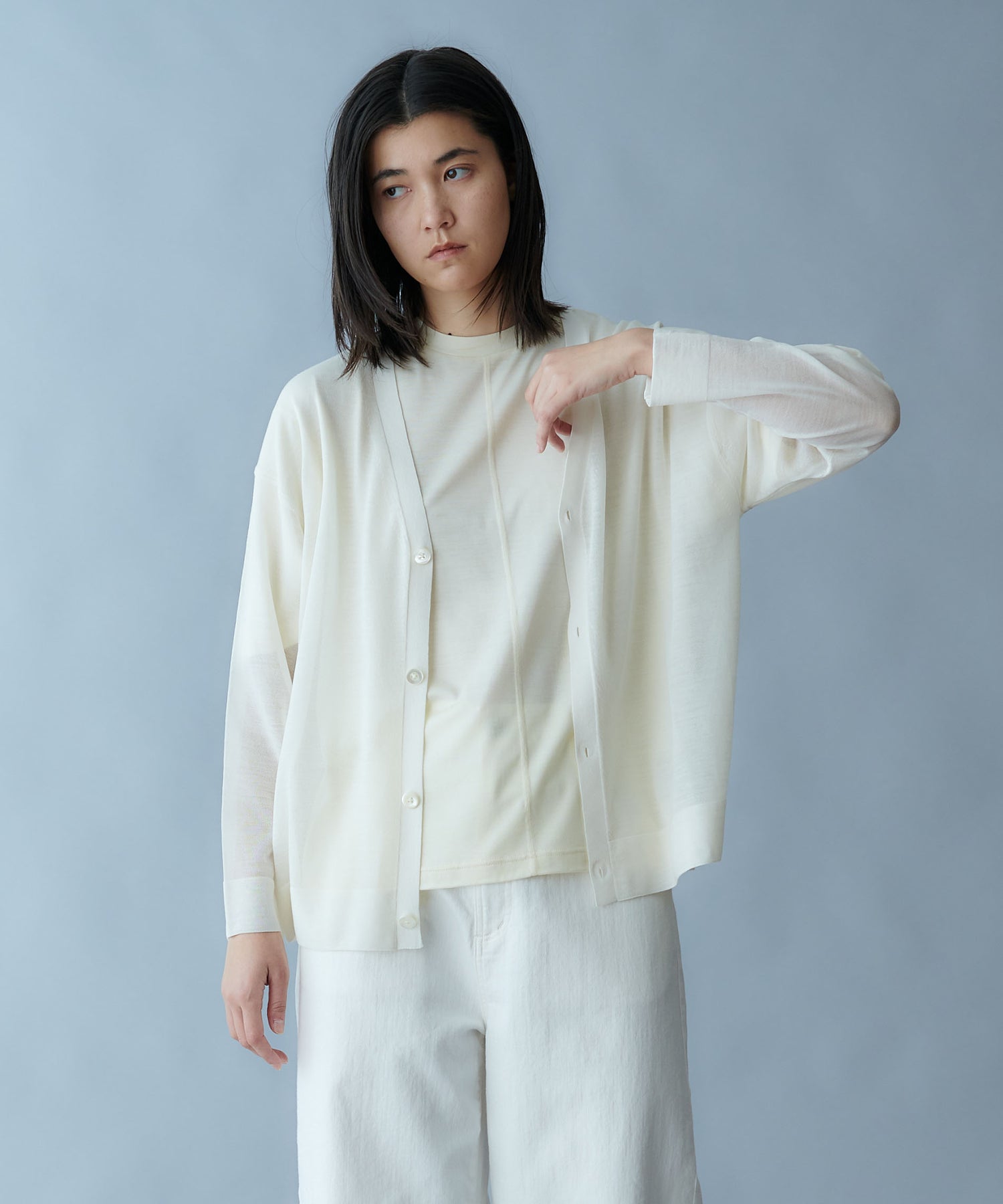 細番手の梳毛ウールとシルクを組み合わせた高品質の糸を、度目を詰め過ぎずに編み立てることで、シアー感を表現したシリーズです。